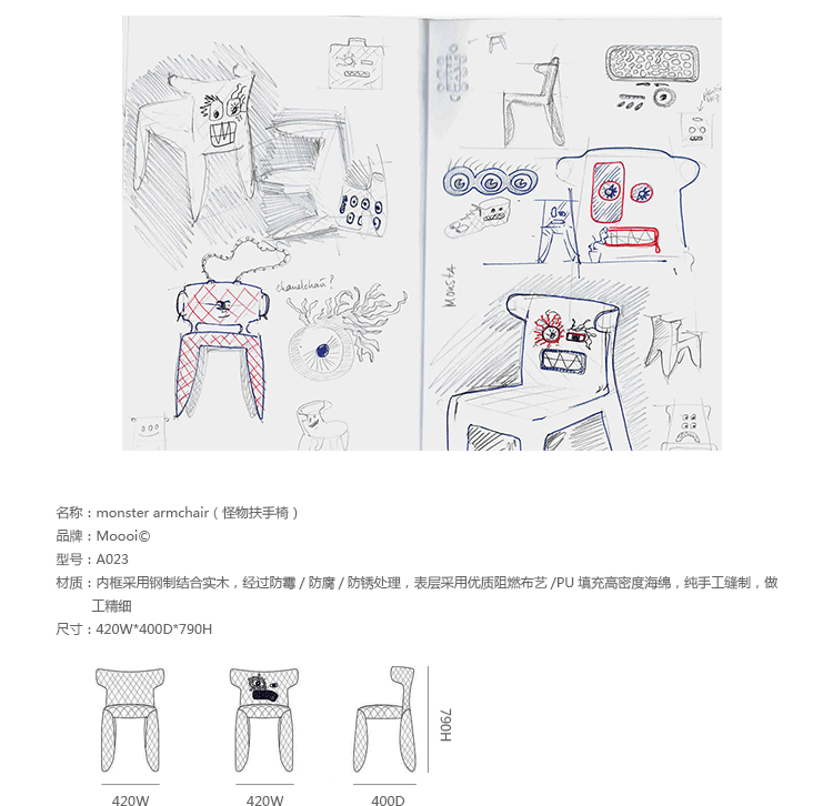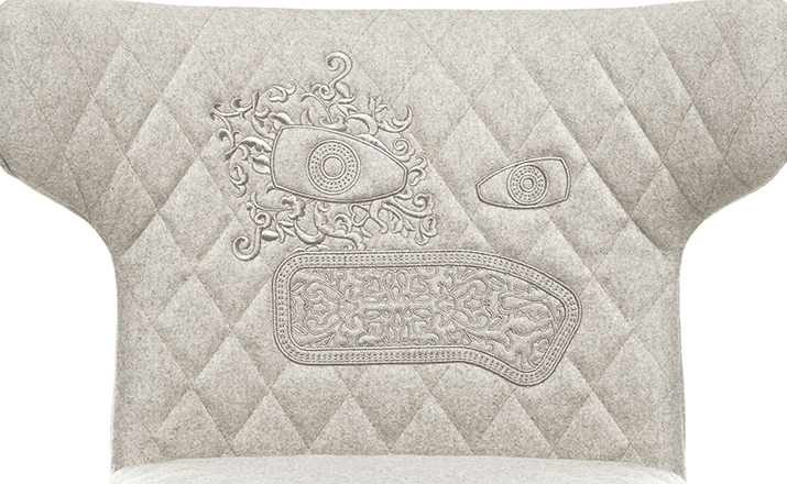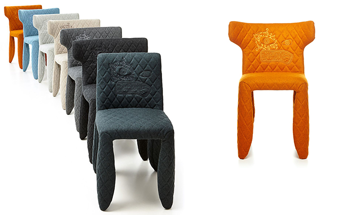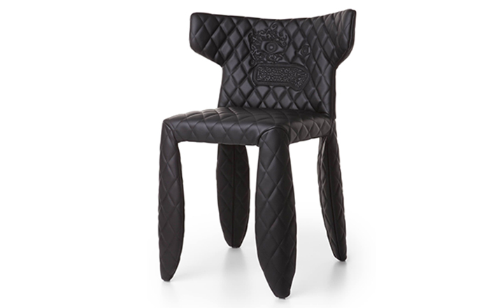 "A soft,puffy and stylish chair with an optional monster face embroidered on the backrest.The monster is a symbol of the eternal battle between opposite forces that take place in life and can be easily recognized inside ourselves,if we have the courage to open our eyes.Scary? Not at all!You forget about the monster once you sit down and enjoy the chair's comfort and softness.Marcel Wanders grew up in Boxtel,the Netherlands and graduated cum laude from the School of the Arts Arnhem in 1988.His fame started with the iconic Knotted Chair in 1996.He is now designing for the biggest European contemporary design manufacturers including Moooi of which he is also art director and co-owner.He works on architectural,interior design and consumer home appliances.His designs have been selected for the most important design collections and exhibitions around the world.Monster chair is offered with a synthetic leather upholstery in black.The chairs can be ordered with or without monster face and with or without armrests. The monster embroidery is identical in both versions."