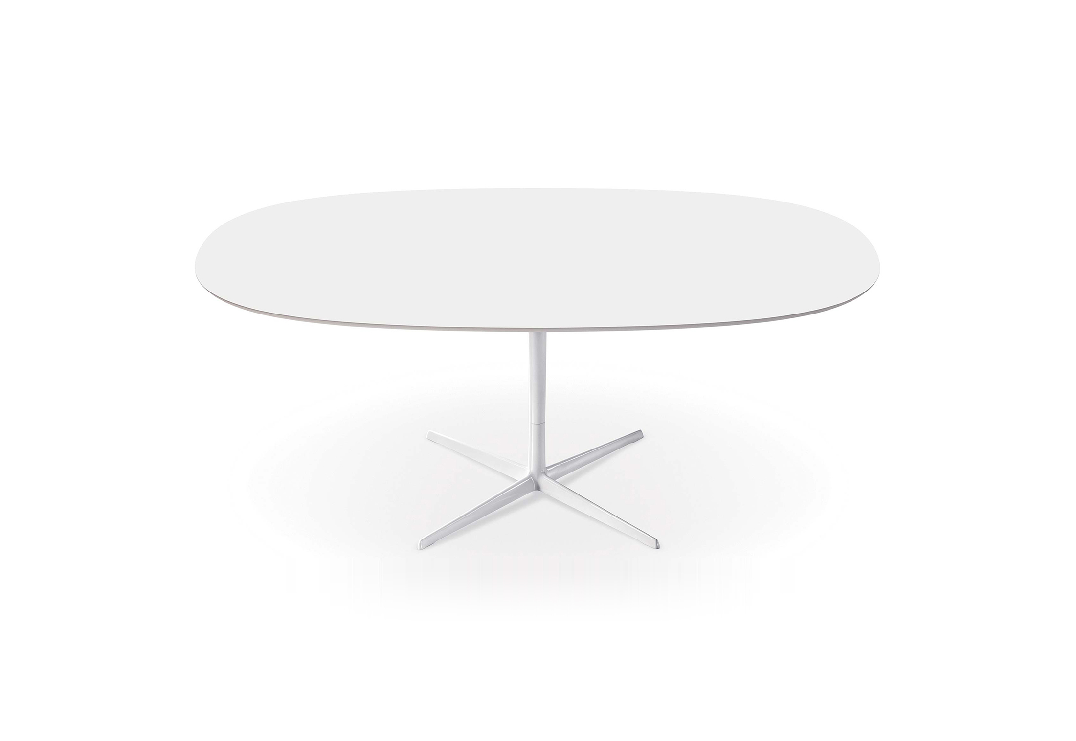 带粉末涂层铝制4向底座和顶部的桌子,白色压花MDF(厚2.5 cm)或层压Fenix(厚2.6 cm)。身高:74厘米。