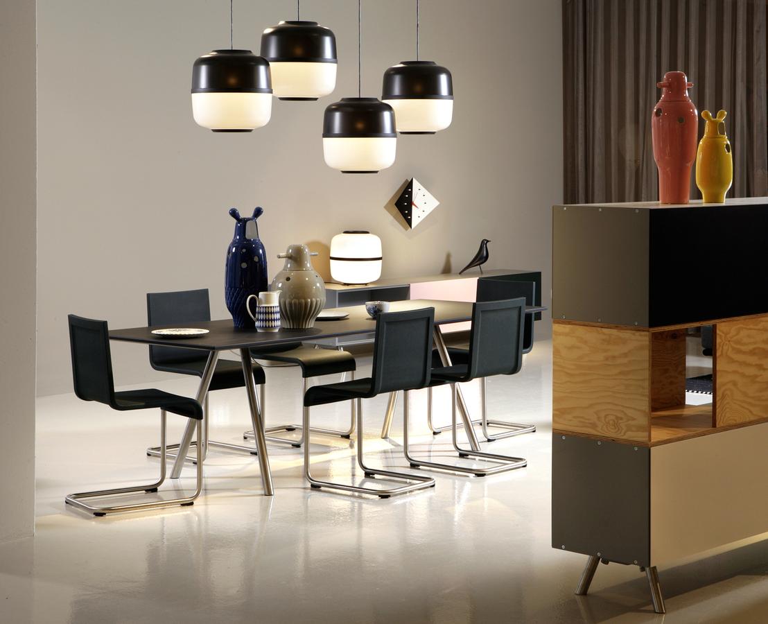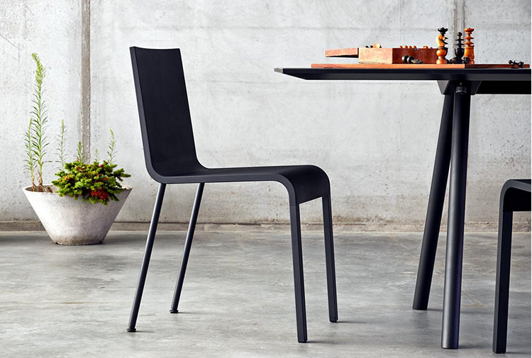 像A-Table这样的纯粹设计使Maarten Van Severen成名:具有象征美感和精心平衡比例的产品成为他的标志。 桌面采用油毡表面,这是一种天然且耐磨的材料,营造出整体效果。 黑色桌腿突出了这种外观。