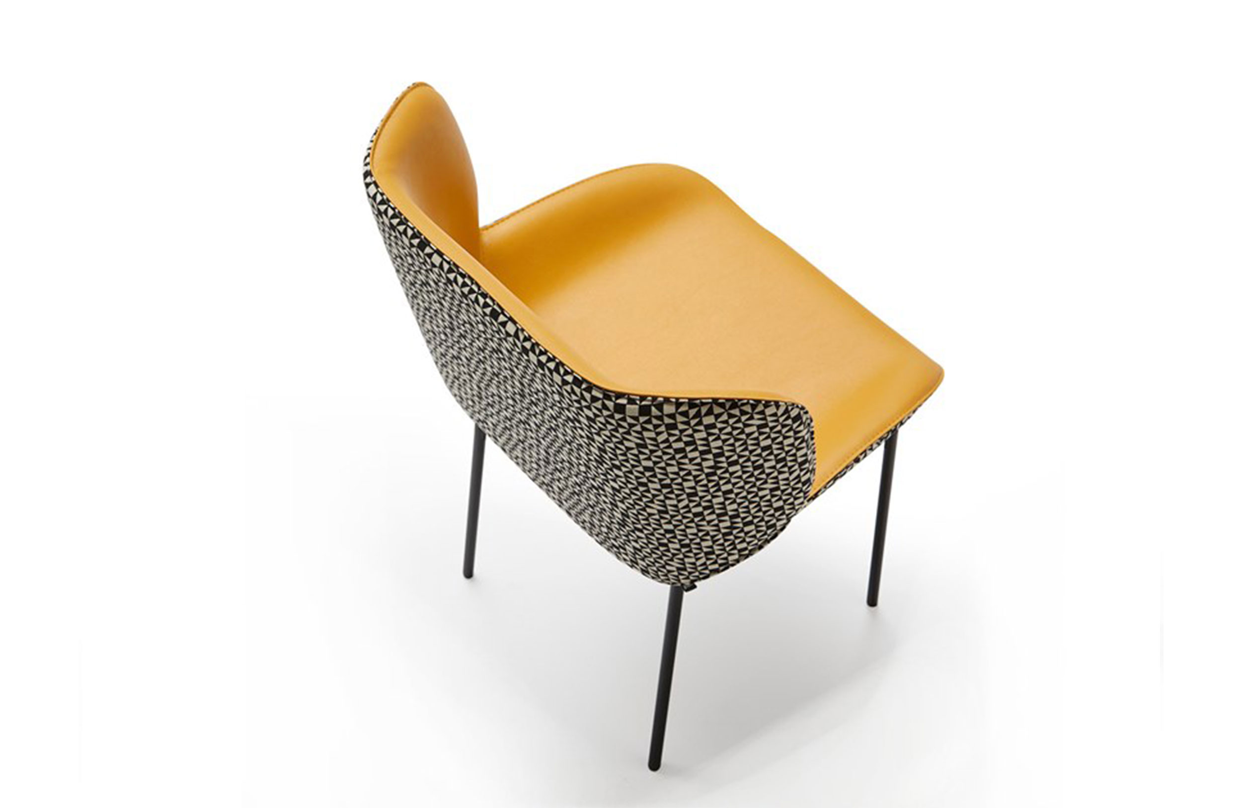 椅子的特点是其大胆的美学座椅和最小的结构之间的对比。当代建筑形式几乎处于平衡状态,一旦你坐在上面就给人一种符合人体工程学的感觉。两个软垫外壳总是优雅地完成了可见的缝合,定义了物体体积和边缘。内部皮革与外部织物之间的对比使得座椅拥抱并且非常舒适,提供适合任何空间(如合同或家居)的组合和饰面的无限可能性。