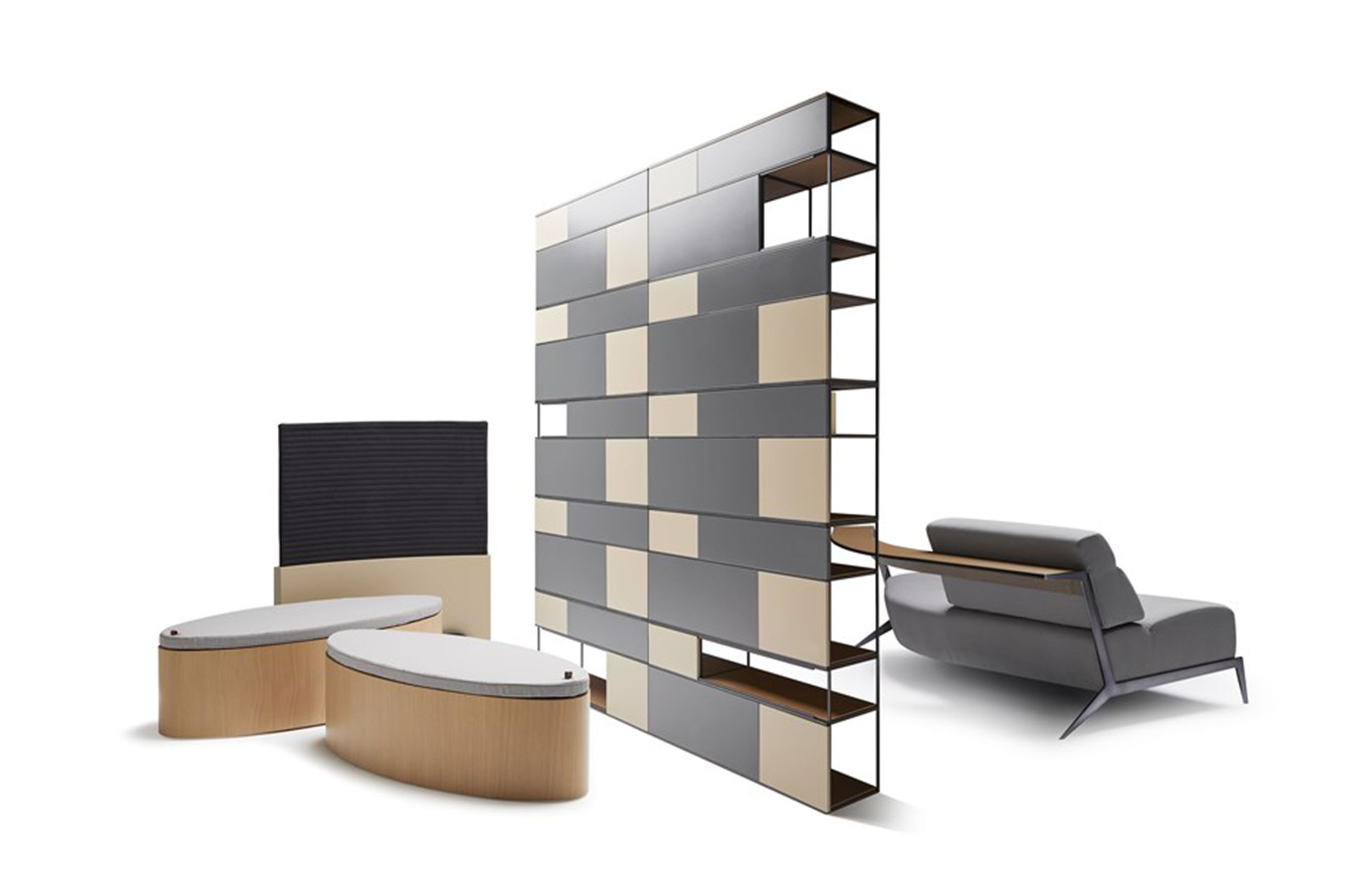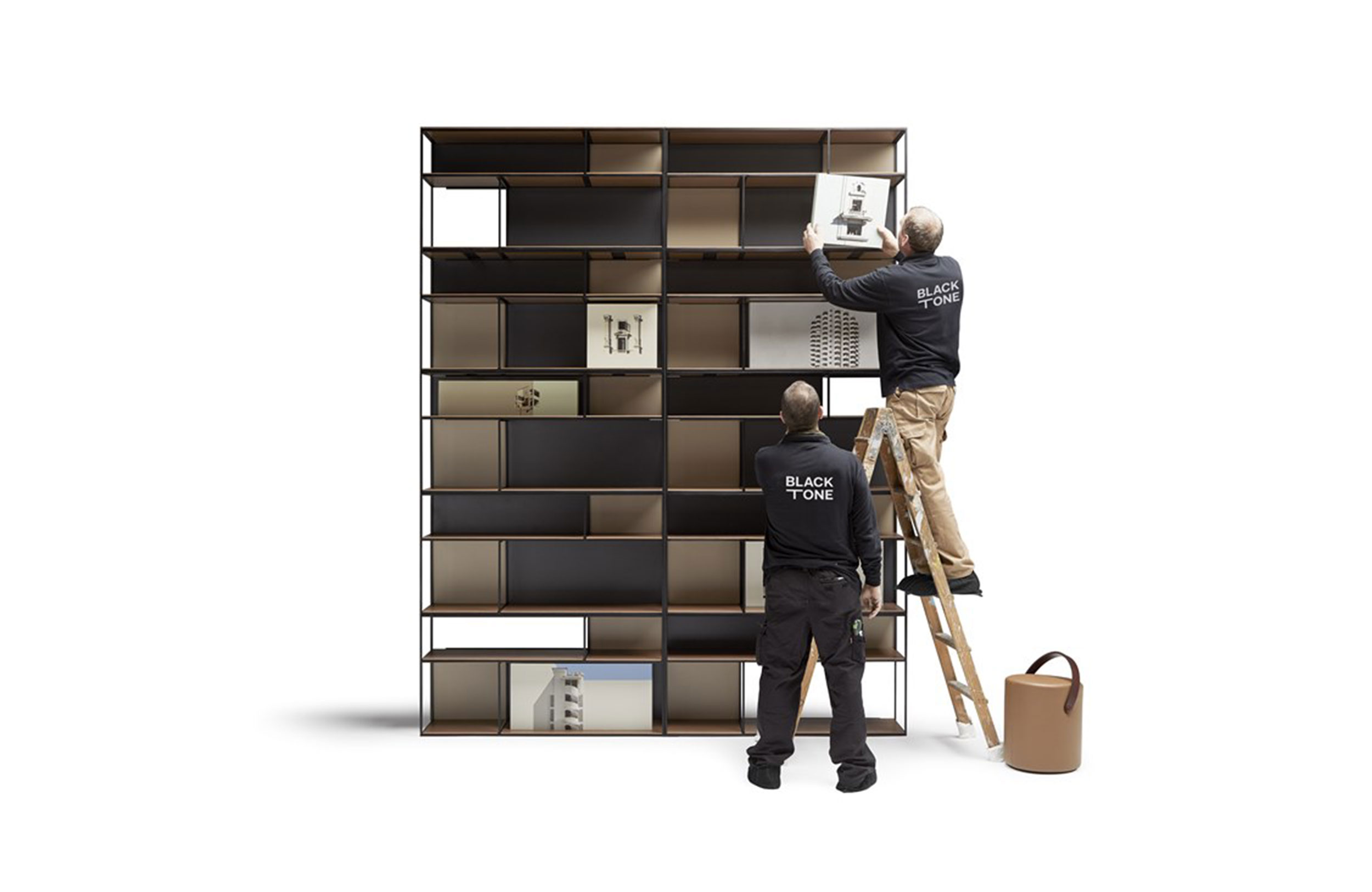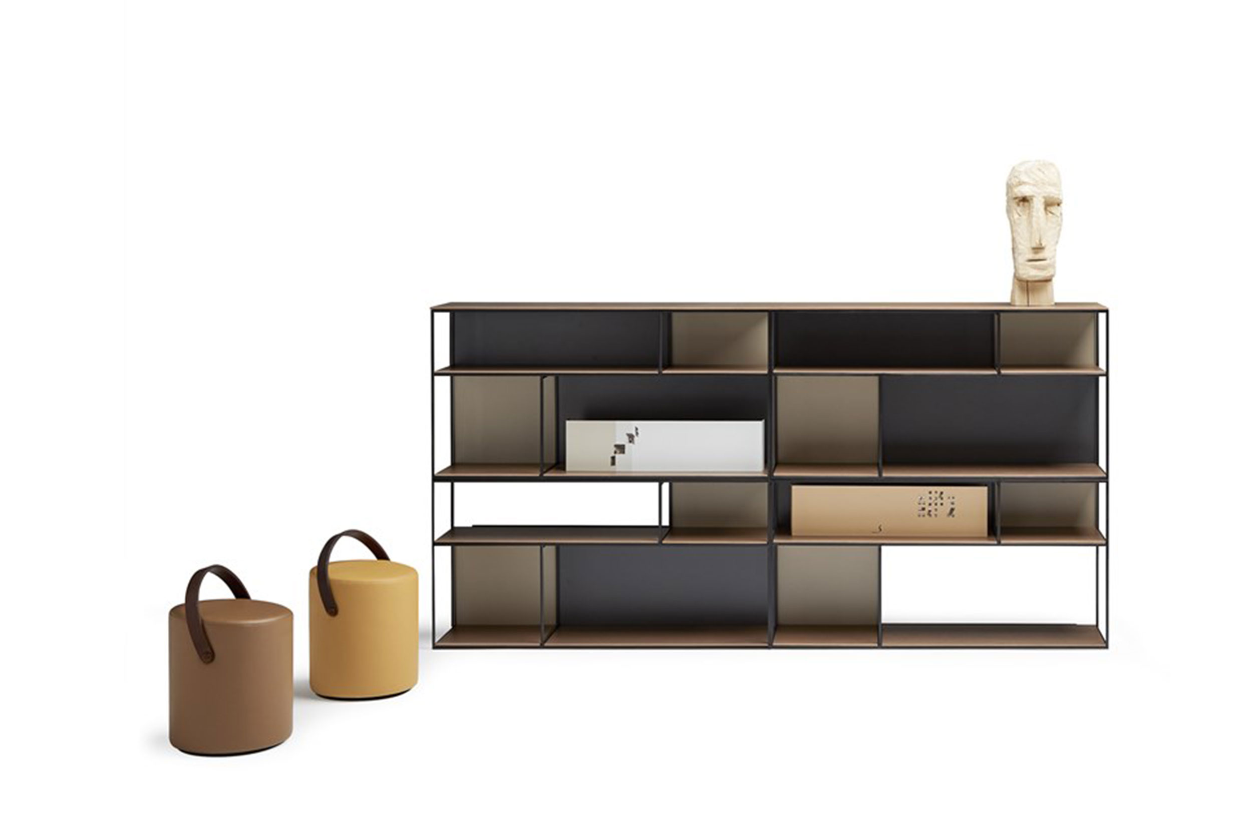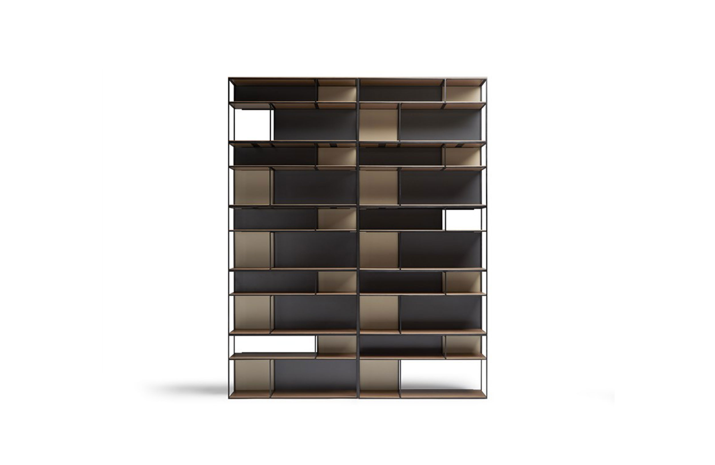 COTA | 书架。由五个重叠的金属结构组成,并且彼此嵌入。在这些结构上放置架子和可互换的滑块。