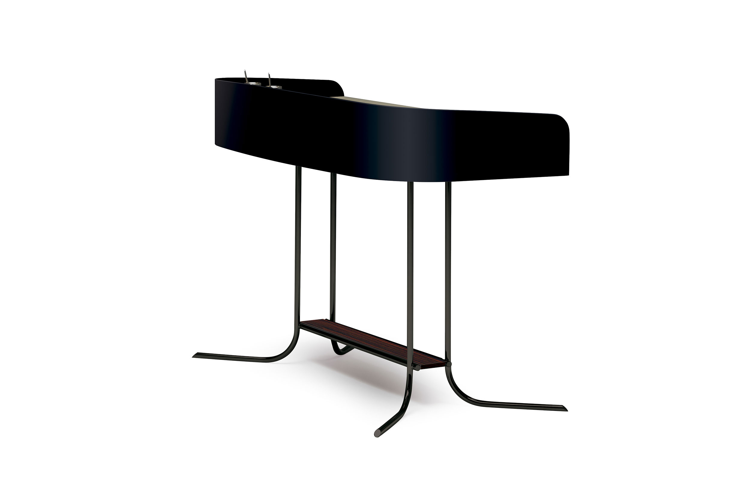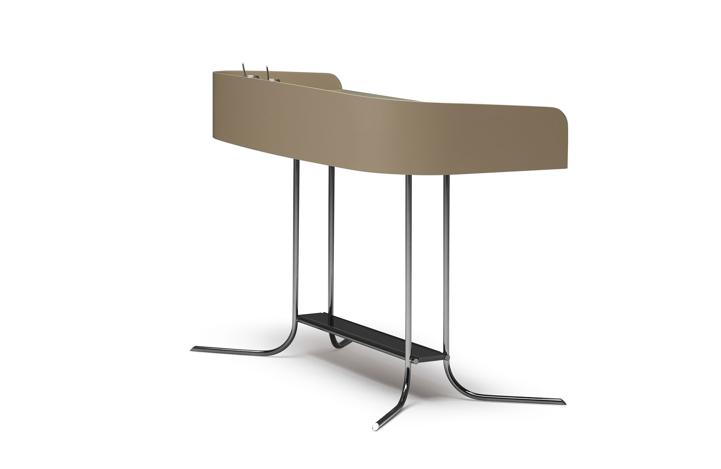 多用途桌子。漆面,背面和侧板有凸起的屏幕。工作区域有软垫表面。桌子两侧配有2个铅笔托盘,中央区域清晰。圆柱形实心挤压金属框架和结构杆结合了实木和金属。