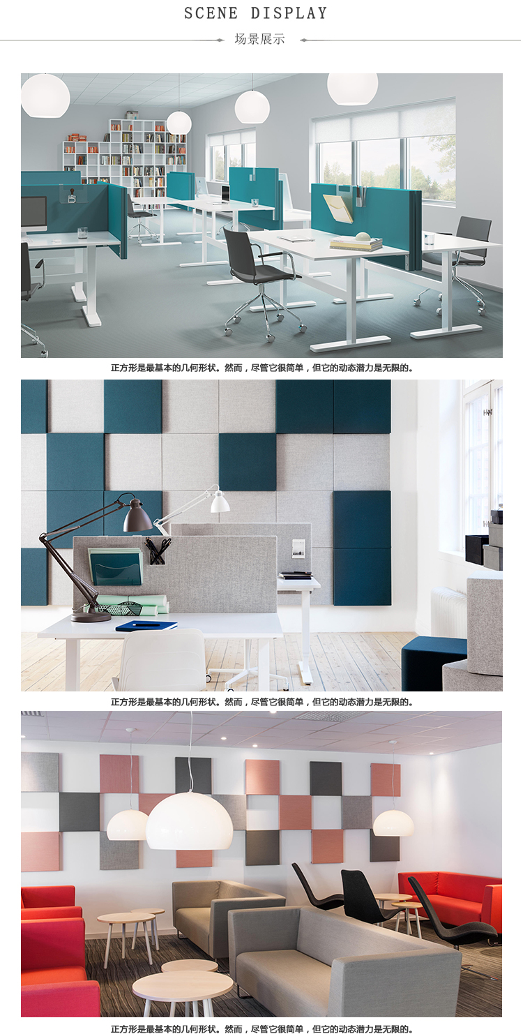 Soneo Wall提供具有吸音方块的功能性创意。由于其时尚,不引人注目的设计,它可以覆盖更大的墙壁区域,从而融入环境。可以使用Soneo Wall的颜色和相对定位创建令人兴奋的阵型。方形墙模块可以组合以创建不同的图案形式。每个模块包括安装在木框架上的吸音再生聚酯填料。两侧均采用布料。背面配有黑色面料作为标准配置。安装在钢制墙托架上。