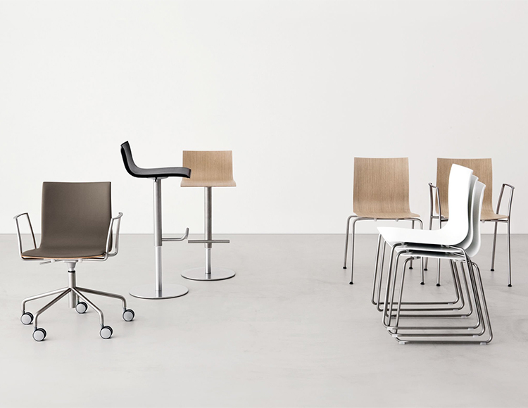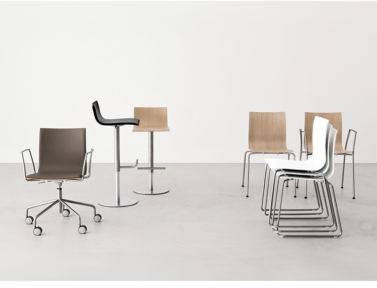 带或不带扶手的椅子系列,也可堆叠,有喷砂不锈钢AISI304框架,可提供多种型号:四腿框架,雪橇底座,脚轮带高度可调旋转座。有厚度变化的木制灯壳灵活性和精细的外形:有几种木饰面,也有织物或软皮革或全软垫的座椅垫皮革制,顶部有缝线。与之配套的凳子配有旋转座和可调高度。列喷砂不锈钢,底座覆盖有不锈钢板和“亚麻布”图案。