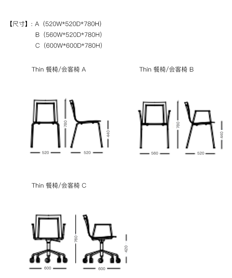 Thin 餐椅/会客椅 系列尺寸/示意图