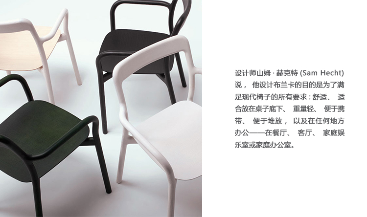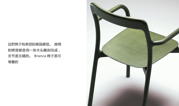 布兰卡椅让人想起了树的枝叶——也就是树的名字。这把椅子有典型的美国感觉。座椅和椅背都是用一块木头雕刻而成,关节是无缝的。Branca椅子是可堆叠的,并且设计用于日常使用。