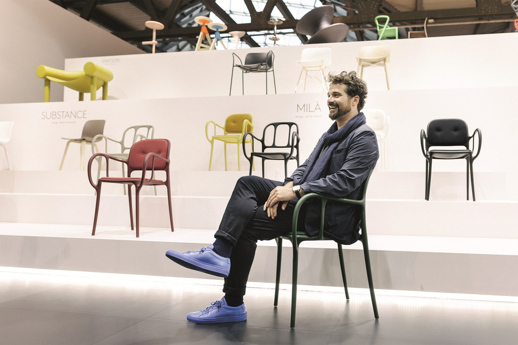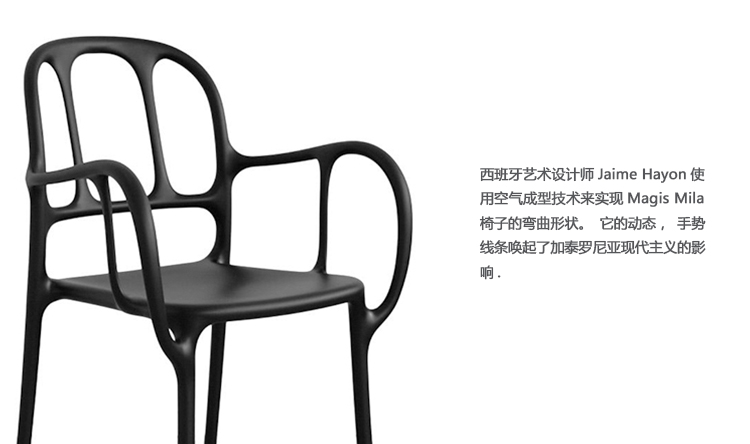 西班牙艺术设计师Jaime Hayon使用空气成型技术来实现Magis Mila椅子的弯曲形状。它的动态的,手势线条让人想起加泰罗尼亚现代主义的影响,而它的玻璃纤维增强聚丙烯材料(这是Hayon的第一个,他通常在木材、金属或陶瓷上工作)在应用和着色方面都具有通用性。Mila的高度可达六英尺。