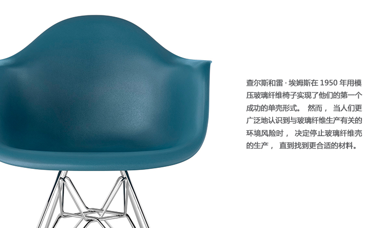本单品为Eames Plastic Chair 系列成员之一,舒适的椅座外观设计是以添加了玻璃纤维强化的塑料来制作,再搭配上各式不同的脚座来增添使用的多样化,值得一提的是Eames Plastic Chair 的创新技术与材质,便它得以成为全世界第一张被大量制造的单椅。拜现今创新的科技所赐,全系列的Eames Plastic chair 终于再次制造,使用环保可回收的聚丙烯材质,求制作线条优美的椅座外壳,不但重量更轻,同时更具有更好的耐热性及抗化学性。