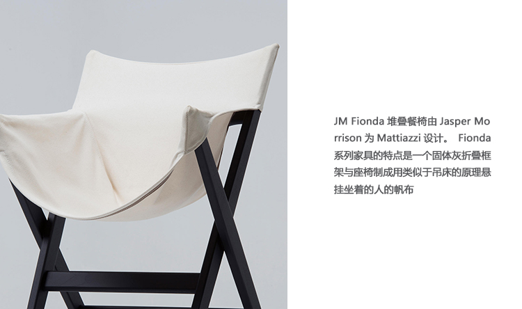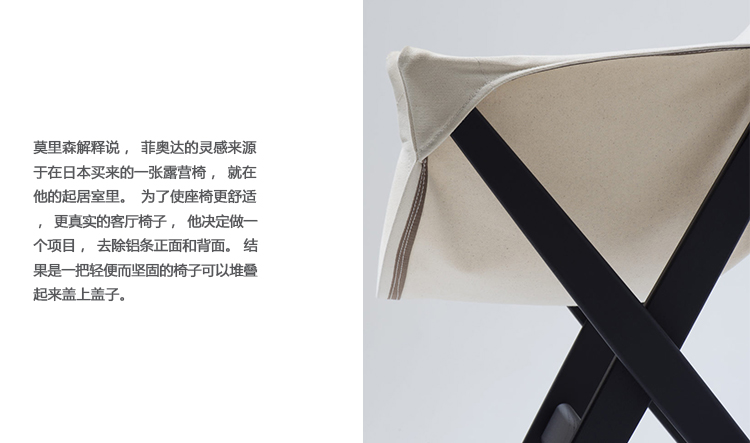 莫里森解释说,菲奥达的灵感来源于在日本买来的一张露营椅,就在他的起居室里。为了使座椅更舒适,更真实的客厅椅子,他决定做一个项目,去除铝条正面和背面。 结果是一把轻便而坚固的椅子可以堆叠起来盖上盖子。
