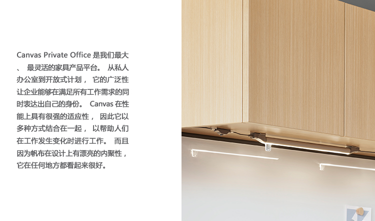 Canvas Private Office将Canvas Office Landscape的多功能性带入封闭空间。 为私人办公室设计的产品可以帮助人们高效地工作。 材料和尺寸的选择允许创造性的方式来提供空间 - 从传统到现代,为个人或小团体。 鉴于其产品线,Canvas Private Office产品可与Canvas平台上的任何产品配合使用,在办公室内保持一致的外观。