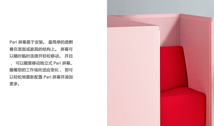 Pari是一个屏幕系列。 有些版本是独立式的,有些版本是贴在表面或框架上的,所有版本都是可粘的,并且共享无框架,薄的外形。 它们一致的细节和互补的颜色有助于美学的连续性,因为它们描绘了空间并提供了隐私。 Pari Screens与许多Herman Miller产品兼容,可在办公室环境中进行设置。 使用Pari Screens,组织可以压缩工作站并在较低的墙壁高度进行标准化,而不会牺牲员工所需的隐私,以便他们可以集中注意力,或创建个人空间的边界让他们感到舒适。