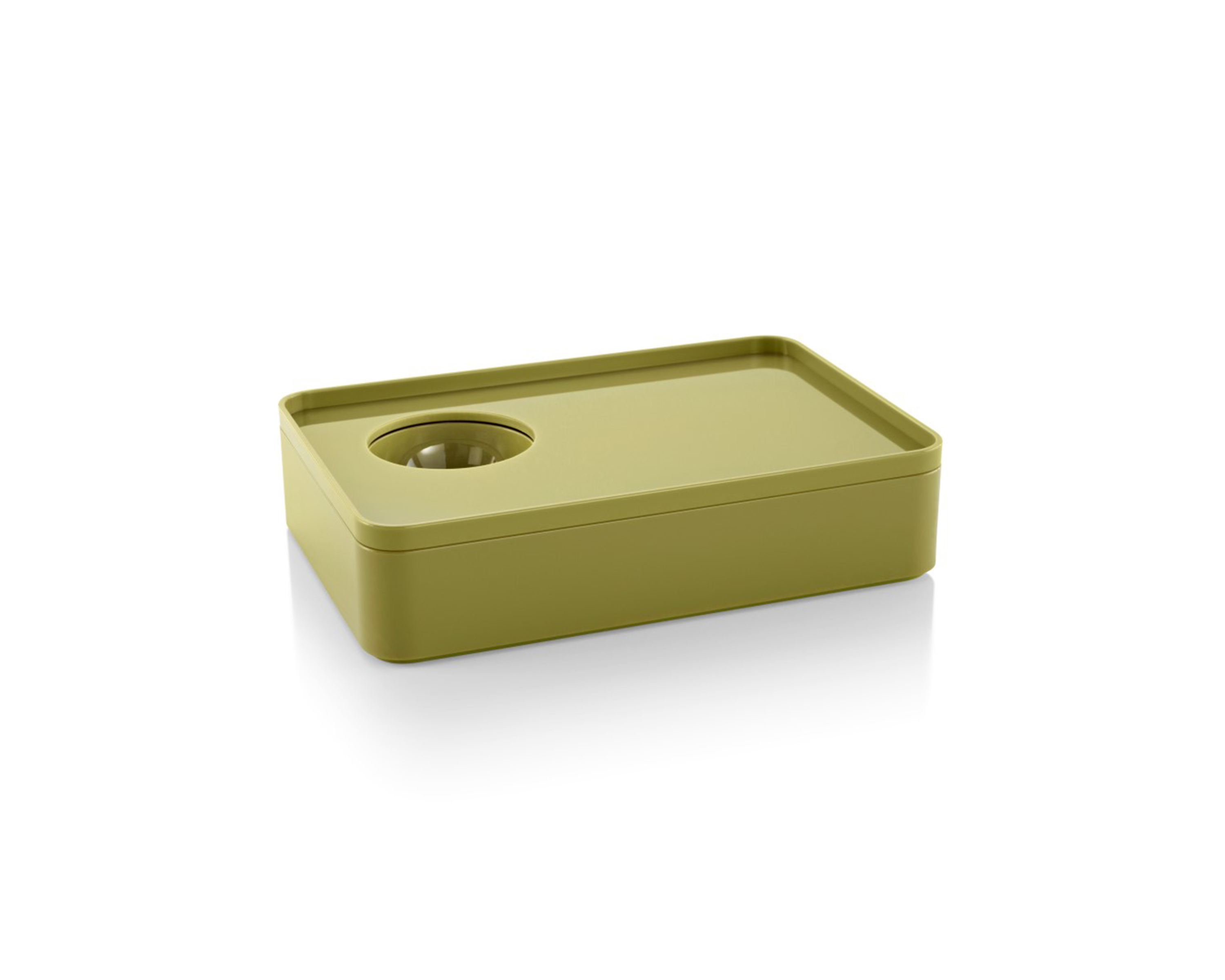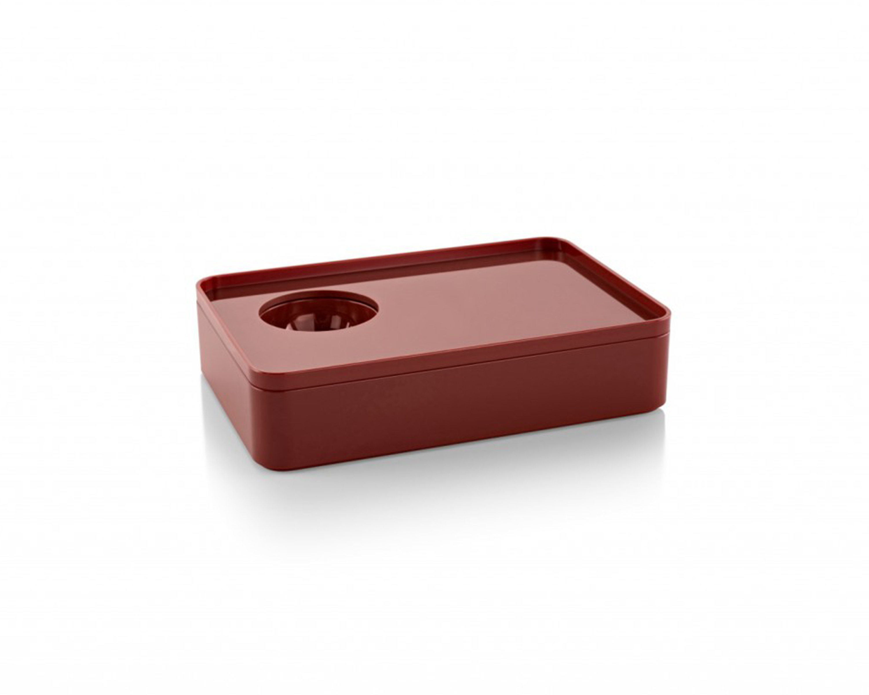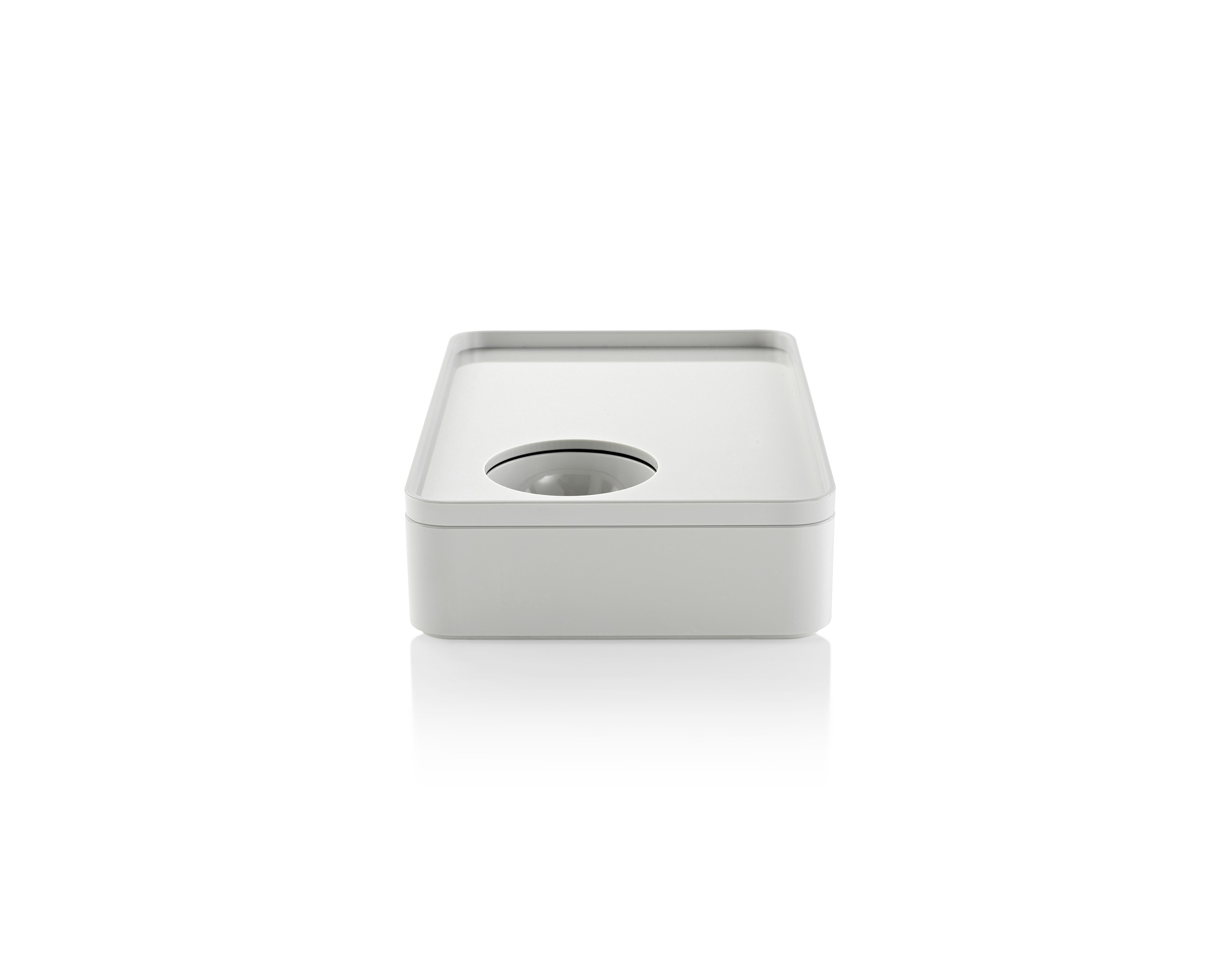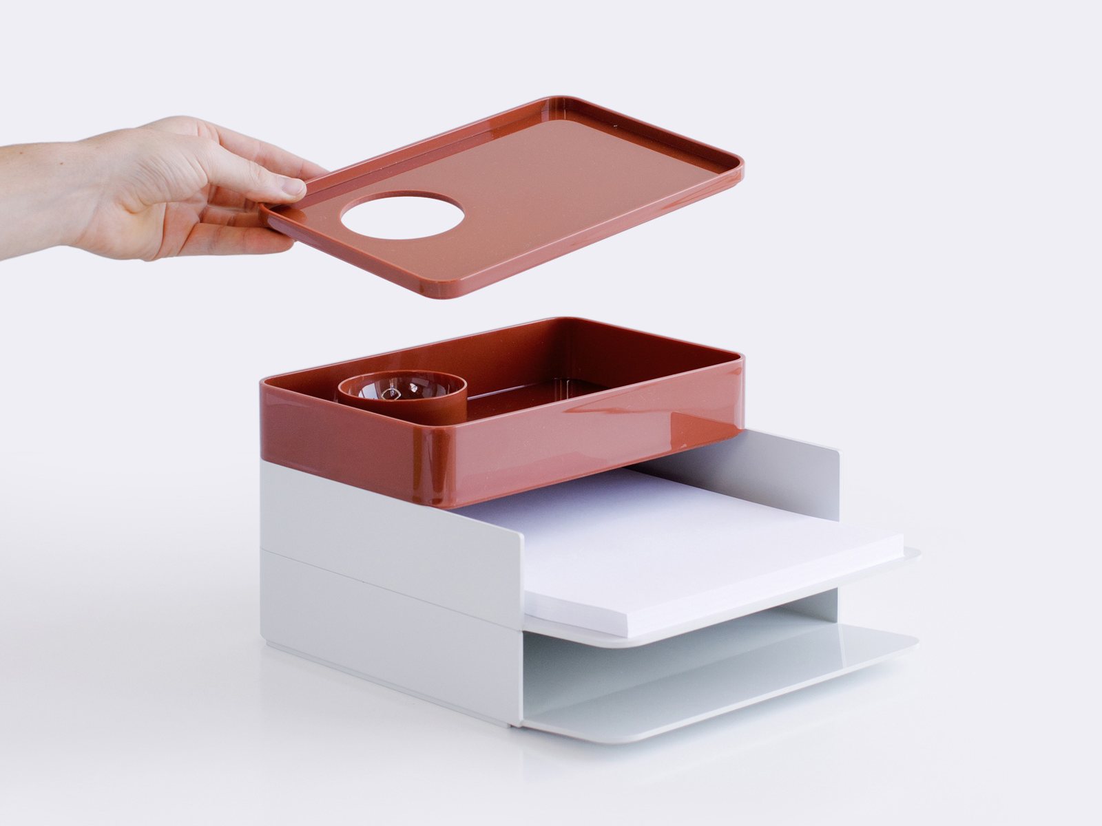 考虑到占据家庭及办公室空间的笨重物品的存放问题,Sam Hecht和Kim Colin设计了具有可拆卸盖子的储物盒。每个盖子上设计有孔洞,可供放置移动式笔筒。或者,笔筒可固定于储物盒内部孔洞下方压槽中,从而在无需打开盖子的情况下便可接触杯中物品。