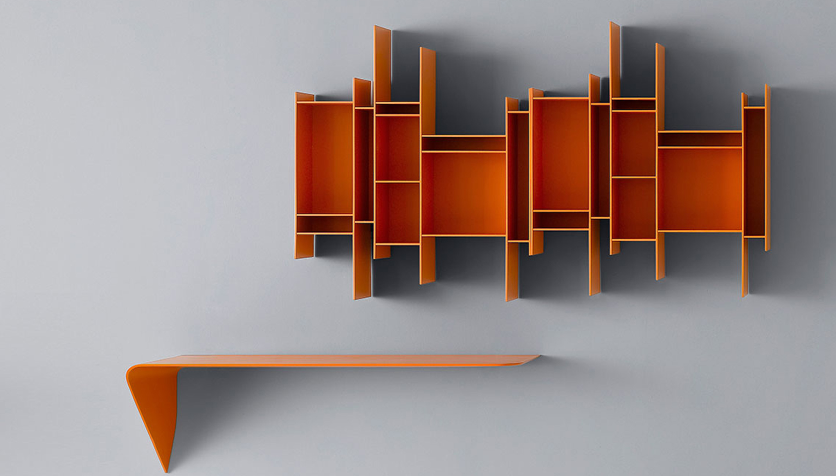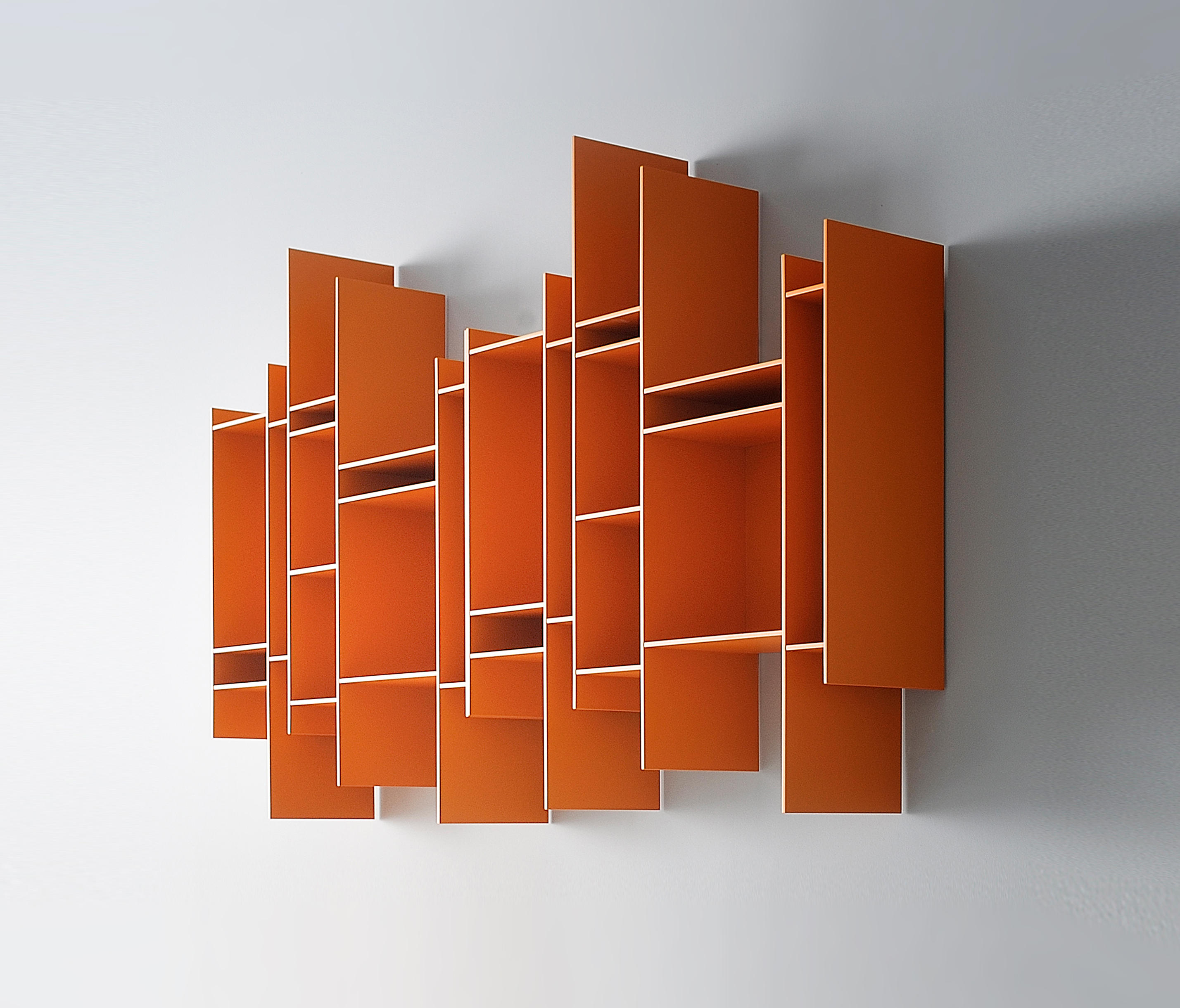 悬挂式书柜,由木纤维板制成,带有哑光漆(微面漆)白色,橙色,沙子,绿色,中灰色,并具有新的外观:浅灰色,粉红色,粉红色橄榄色,中橄榄色,深橄榄色,中粉蓝色,深粉蓝色。 立柱和在厚度为6mm的货架; 从三聚氰胺涂装板回做, 通过侧翼或者从头开始设计你自己的,你可以创建一个很大的冲击大型配置。 DIMS 高度96,长度81.6,深度20厘米。 单个单元可颠倒过来。