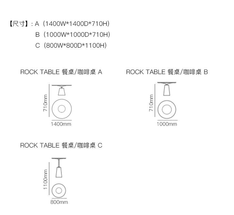 ROCK TABLE 餐桌/咖啡桌 系列尺寸/示意图