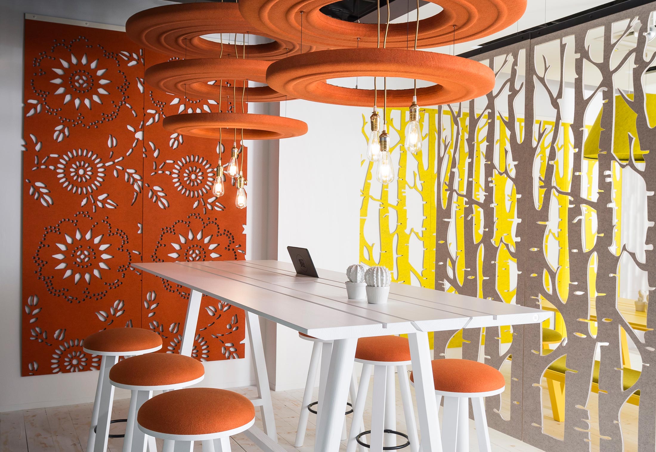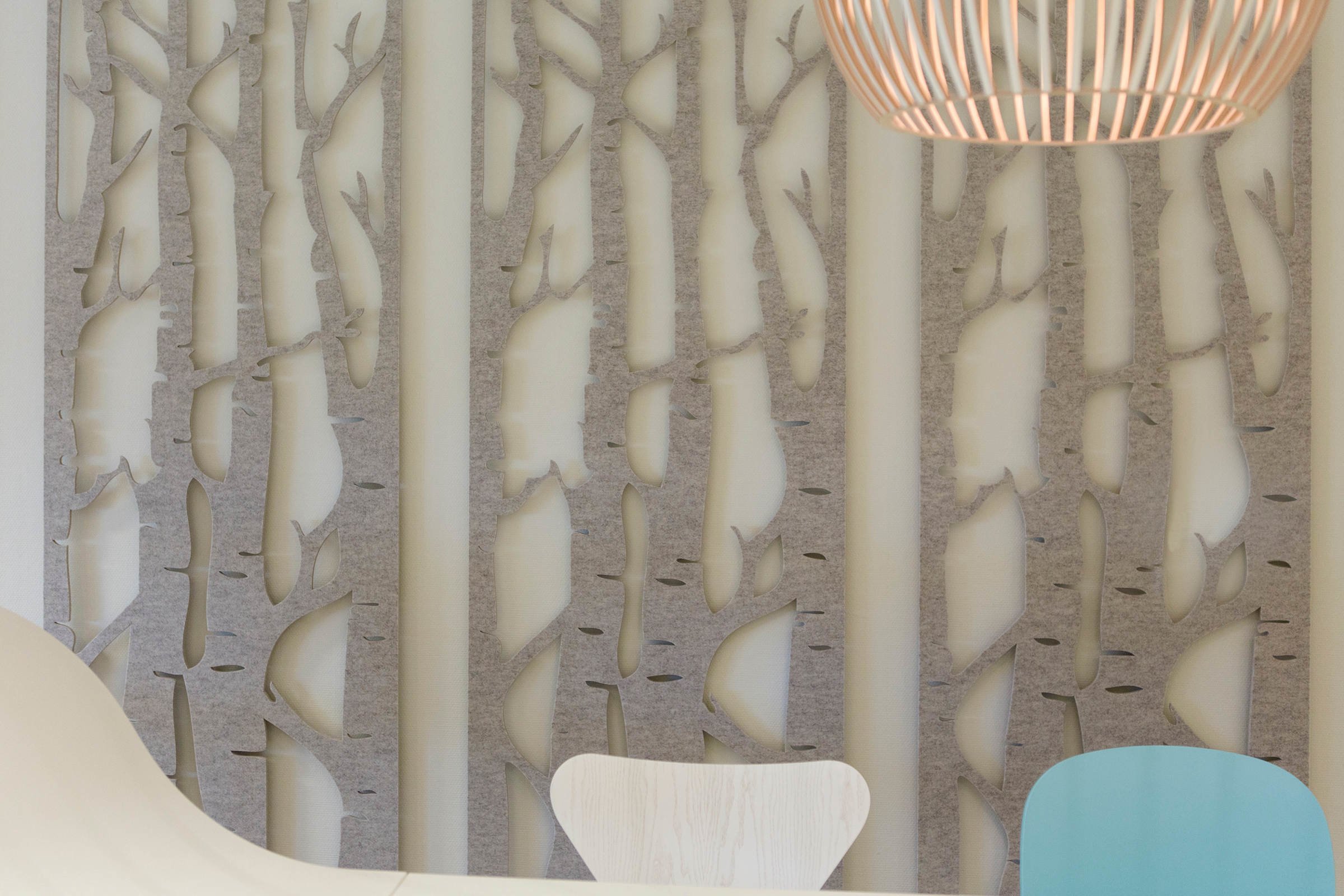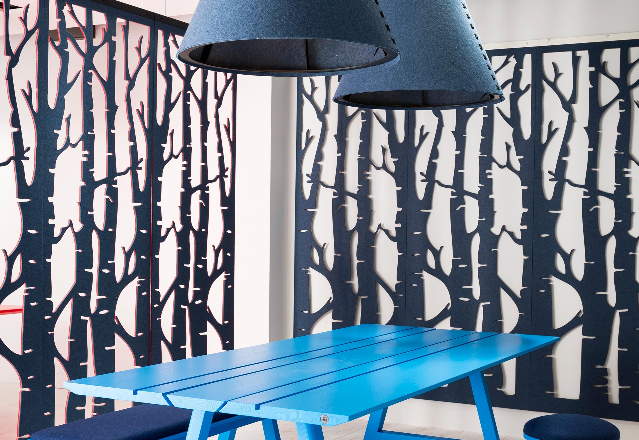 通过这种浮动的装饰面板集合创造一个隐私层,这些面板提供具有声学优势的艺术风格。它们将有助于减少声音的传递,并减轻诸如铃声之类的高音以及键入和点击的声音。它是一种优雅的元素,可将房间划分为一体。这些吸音板由双层BuzziFelt制成,采用大胆的图案进行精确切割,并具有一系列亲生物和几何图案。 您可以选择将BuzziFalls安装在墙壁或天花板上还是悬挂在上面。BuzziFalls Rail是另一种选择,它可使面板轻松滑动-创建可移动的房间隔板,从私人空间转移到公共空间。 面板在一条三米长的轨道上运行,面板从左向右滑动。通过为导轨安装两层平行轨道来创建滑动门的效果。 使用可用的新材料选项BuzziFelt Printed将BuzziFalls提升到一个新的水平 。如果您无法决定自己的喜好,请从10张照片中进行选择,并选择一张或两张照片的组合来选择不同的外观。 吸音毛毡结构可确保从正面到背面都具有充分的声学性能。它减轻了区域之间的声音传递,并吸收了高频音调,例如同事的颤音,敲打声或铃声,这使其成为开放空间中的理想空间分隔器。