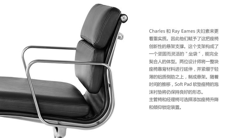 Charles与RayEames夫妇是20世纪最有影响力的设计师,卓越的设计涵盖了家具、建筑、影像与平面设计。他们从二次世界大战中美国海军的实验计画中学习经验并发展可谓是现今工业中使用模铸胶合版的先锋,这对设计界的超级夫妇档自1940年参与了由MOMA举办的有机家具设计大赛,自今已有近百件他们的作品被各大博物馆所永久典藏。 Eames® Soft Pad Side Chair(伊姆斯软包会议椅)是夫妻俩1958年设计的,是在全铝系列的基础上发展的另一系列Eames产品。舒适系列在全铝的椅架上增加了皮革制的柔软坐垫和靠背,高级铝合金制作,压模四星脚,可旋转。背垫和坐垫,采用西皮,具有透气性强,内部填充高密度定型绵,不易变形,不老化,依人体坐姿,符合人体工学,耐水及对人体无害等优势。椅子扶手选用优质电镀铝合金扶手,手感舒适,永久不生锈。转椅底盘为多功能底盘,可以保护使用者长时间坐用腿部健康,且作为高度可多定位调节。气压棒采用的气杆是正规厂家出产的外贸气杆,每一根气杆都有钢印,经过严格SGS检测的才可出厂,旋转、升降自如基本无声响,使用寿命长,可承受250kg,可升降数万次,将椅面调至与膝盖同高时,使用者坐下后双脚跟可垂直平放于地上,且大腿与地面平行,最符合人体工学理论,使用者长期久坐,也不想疲惫。办公椅脚为铝合金材质永久不生锈、承受能力强,安全更放心。椅子脚轮采用优质电镀片脚轮,耐用而美观,可以随意变换位置,贴心更方便,具有防震及防松脱,让椅子的安全性能更加可靠。