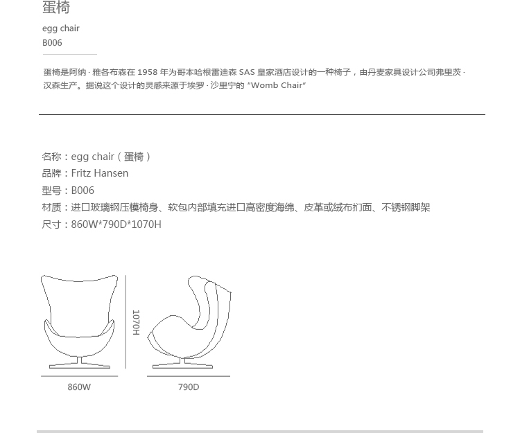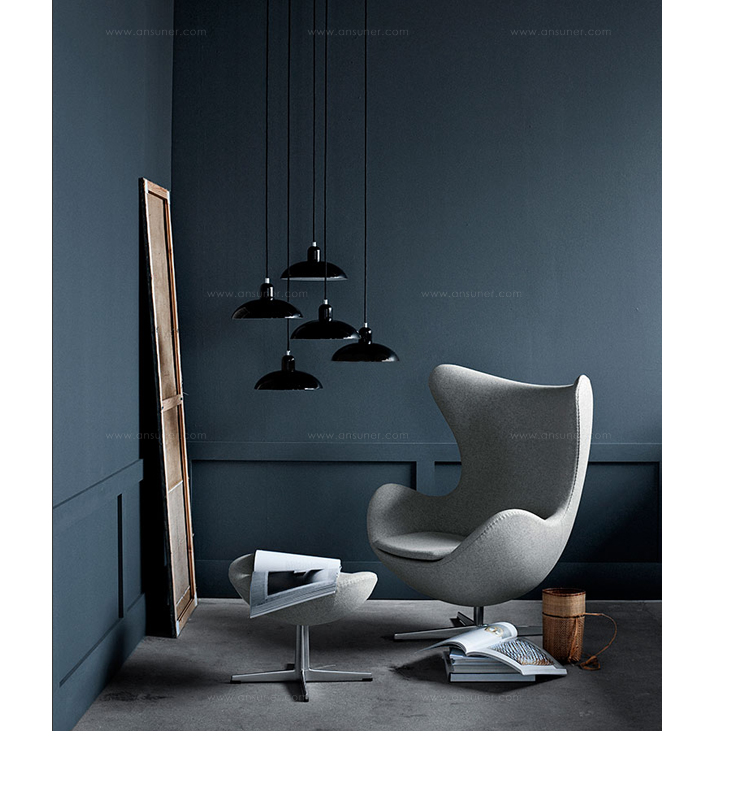 他将自身对建筑的独特见解延伸家饰品,并为一手绘制的建筑结构装点添色,因而摧生出如长着三只细腿的蚂蚁椅(Ant Chair)、蛋椅(Egg Chair)、天鹅椅(Swan Chair)、The Oxford chair等旷世之作,以及雅宅、工厂、展示间、织品、时钟、壁灯与门把等无计可数的多元创作