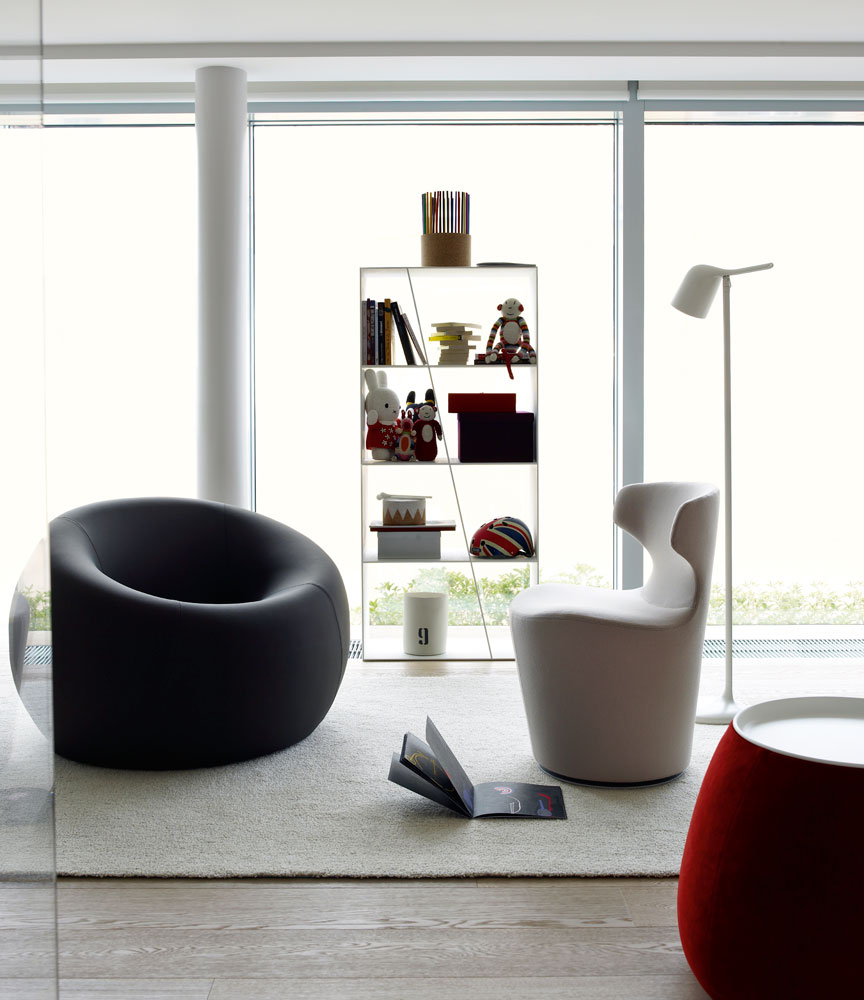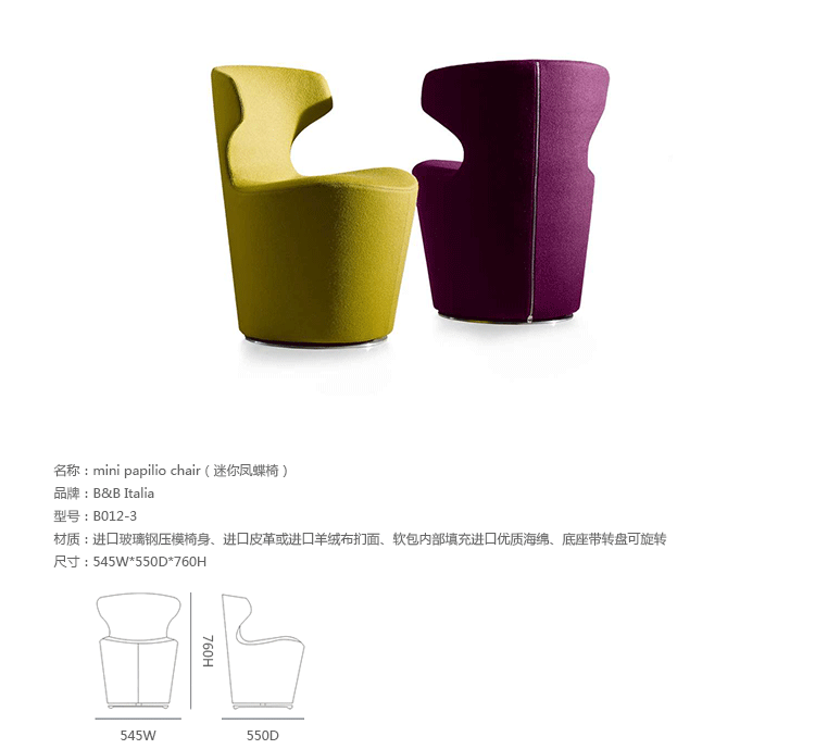 看似由單一材質一體成形的大型雕塑物件,Grande Papilio 流線形的設計從倒置的錐形體中雕塑而來。由下而上漸寬的椅背空間,提供了極致的舒適放鬆體驗。Grande Papilio 旋轉 360° 的底座系統能自由自在的環視空間中恣意流動的美好。強烈雕塑個性特質的 Papilio 系列家具也持續的擴大當中,不同大小和用途的 Papilio 家族:Papilio、Piccola Papilio、Grande Papilio、Love Papilio、Mini Papilio、Papilio Ottoman 提供了多元而完整的舒適空間。