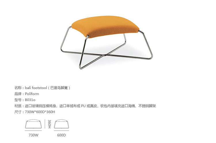 Bali Armchair(巴厘岛扶手椅)系列家具由著名设计师Carlo Colombo为Poliform所设计,包括扶手椅和脚踏。该系列家具根据最新的美学设计提供松弛的居坐度。制作采用光滑的不锈钢金属框架,进口玻璃钢压模椅身,高级羊绒布或PU或真皮、软包内部填充进口海绵,提供了绝佳的舒适度,是模块化及功能化的有机结合,提供多功能性的使用方式,与任何家具配合度都非常高。