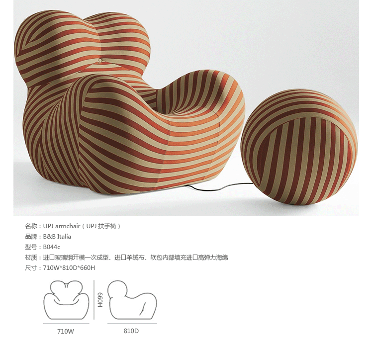 1969 年,意大利家居品牌 B&B Italia 发布了由世界著名设计师 Gaetano Pesce 设计的一系列包括7个单品聚氨酯泡沫椅子,其中就有日后在国际上大受好评的 UP5 。UP5 是一张扶手椅,它独特的结构和仿生设计灵感来源于女性的曲线,工艺上面的创新,和对当时社会对女性的性别歧视所作出的微妙诙谐的抨击,使它称为一件别具一格的作品,并被认为是意大利设计的经典作品之一。2014年, UP 系列椅子迎来了一个新的款式: UPJ ,「 J 」代表「 Junior 」,意即少年。可想而知, UPJ 是专门针对儿童的一款扶手椅, 不过,如果你以为有什么大的变革那就大错特错咯。其实,UPJ 和早期的 UP5 在造型上并没有什么变化,只不过缩小了尺寸。但是,当你看到可爱的小朋友和小伙伴们在一起愉快的玩耍和一些温馨的亲子互动后,也许你又会想,这又有何不可呢?