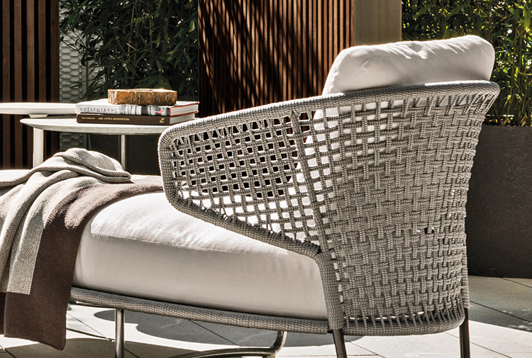 Aston是一个单品家族系列,其中包括沙发、沙发床、扶手椅、脚凳、座椅,为家居环境和“共享空间”提供优雅而时尚的装饰,在室内和室外皆可应对自如。阿斯顿“绳”户外系列采用金属材质的构架,搭配Pewter色聚酯漆面,部件都针对户外环境而经过特别处理,覆面采用疏水性纤维面料。靠背采用直径为7毫米的特殊聚丙烯纱线编织而成,两种颜色可供选择:浅灰色和深棕色,与全新Art Lifescape 02系列的面料和Alison “Dark Brown”户外系列的色调相得益彰。针对户外环境的特点,金属构架经过特别处理,搭配Pewter色聚酯漆面,覆面采用特殊聚丙烯纱线编织而成,有两种颜色可供选择:浅灰色和深棕色。坐垫采用Minotti Studio独家设计并通过激光加工而成的几何装饰。靠垫的内部填充物是高弹性聚氨酯泡沫,覆面采用疏水性纤维面料。