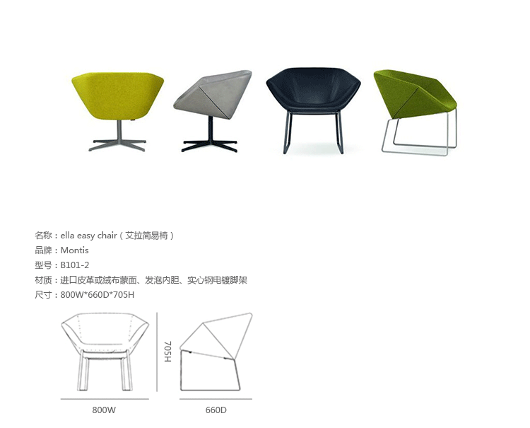 Ella Easy Chair(艾拉简易椅)由著名设计师Niels Bendtsen设计的。这把椅子是一个紧凑的座位让你采取的所有礼仪坐姿轻松而获得适当支持.一个显著的特点是它的扣盘形状,连同它的几何面两侧扶手椅给一个真正独特的外观.阀座完全由聚氨酯泡沫成型,具有特别高的耐久性.椅子采用进口皮革或绒布蒙面、发泡内胆。