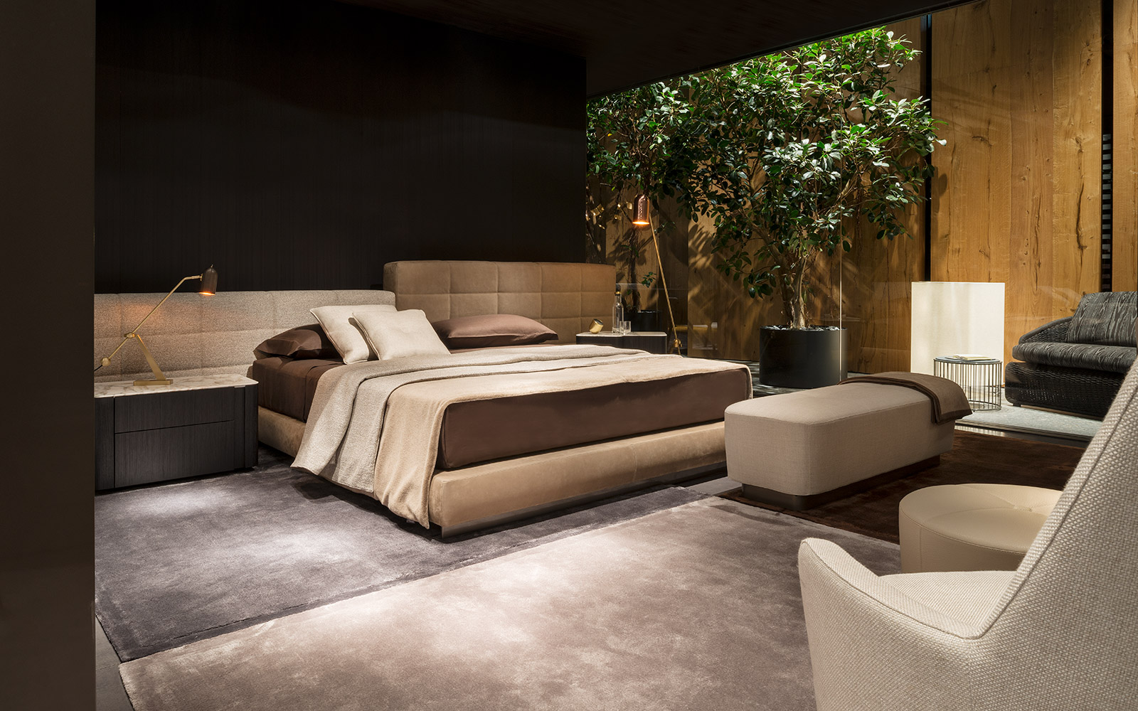 柔和的造型、紧凑的比例和具有视觉冲击力的细节呈现出精致的美学语言,金属基座采用淡铜色的表面设计。