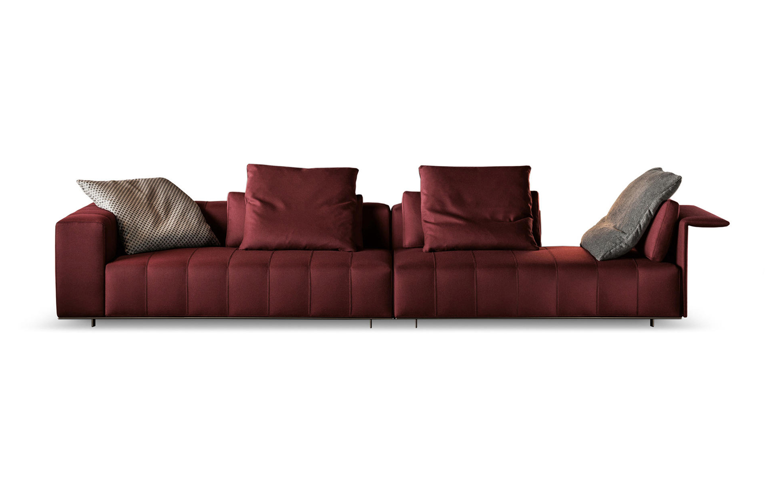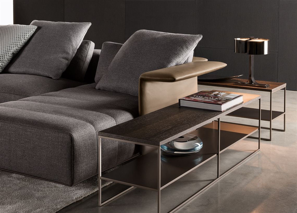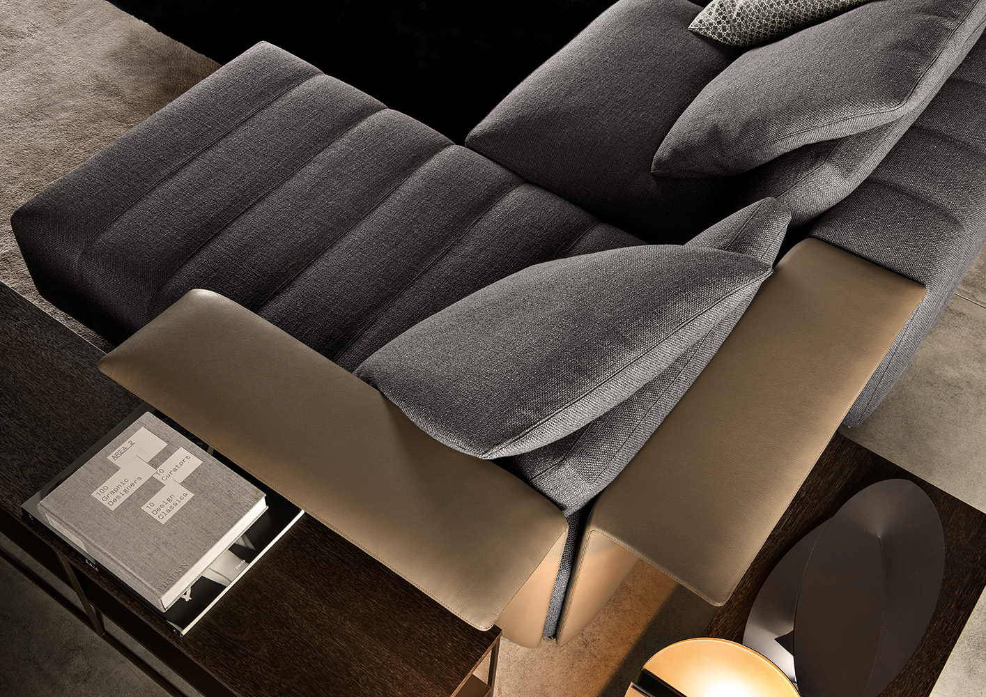 弗里曼“裁缝”项目的理念和原创性在其衍生系列弗里曼“休息室”中也有所体现。弗里曼“休息室”沙发纵深度有所降低,不仅更易搭配较小的居住空间,还可以用在接待场所,如等候室、前台区域、行政办公室。单组沙发的特点在于采用规则图形纹样的优雅缝线设计,可以自由随性地组合沙发,打造灵动的造型。“Wing”扶手拥有轻盈的线条,这要得益于采用聚氨酯为基材的泡沫金属框架。精致的包覆材料展现出公司运用复杂面料进行剪裁加工的实力。皮革和织物面料的各个部件通过浅铜色人造皮革束带和双缝线工艺连接在一起,打造出独特的纵深效果。