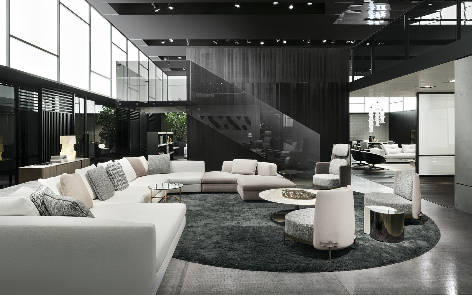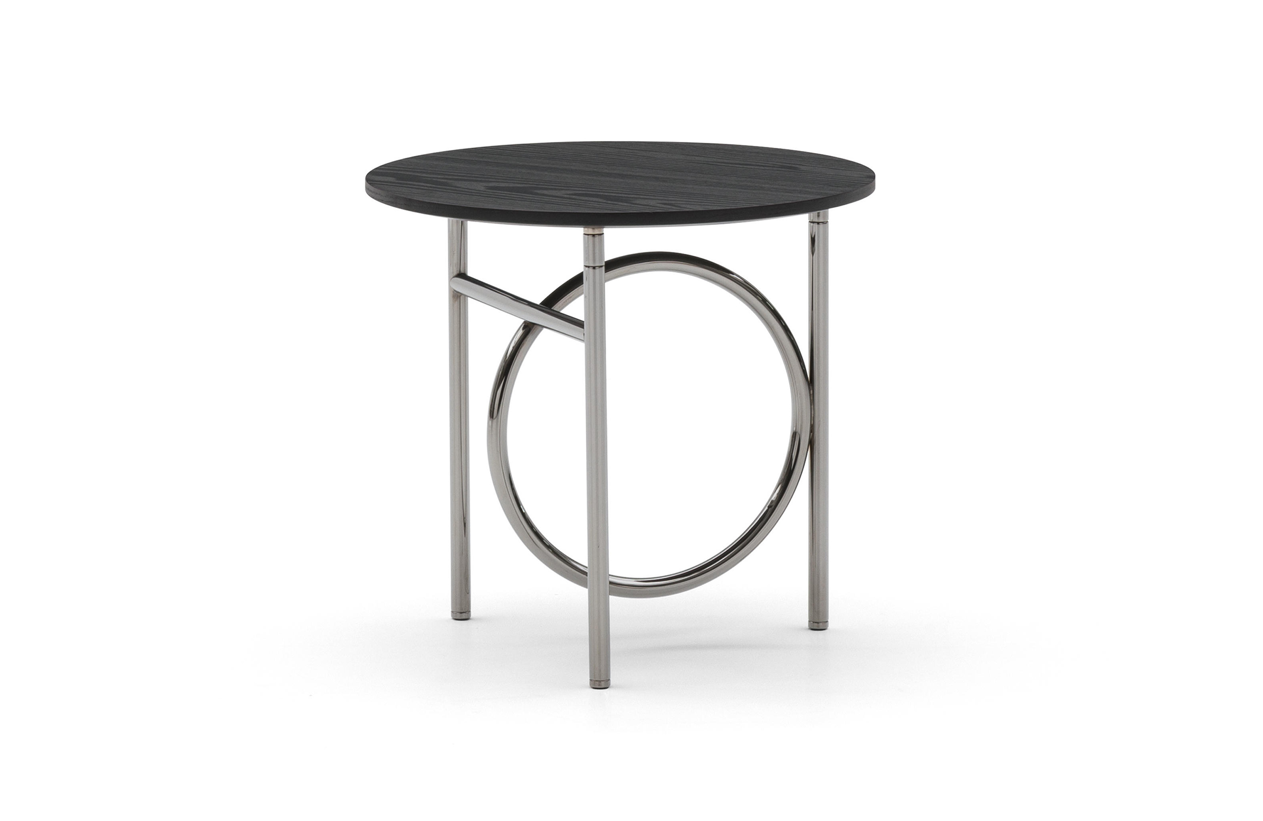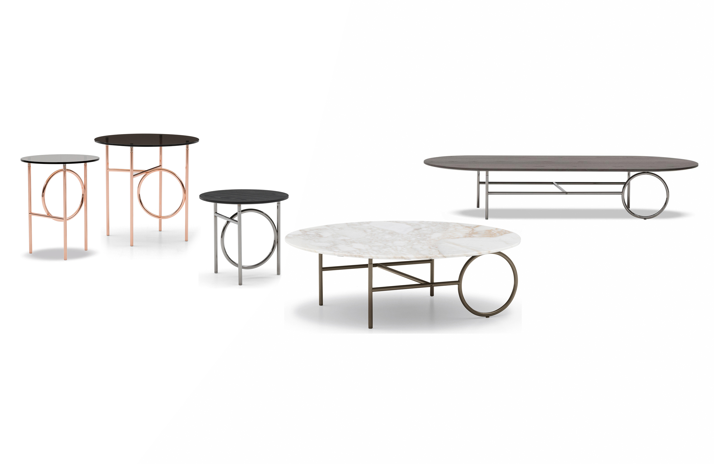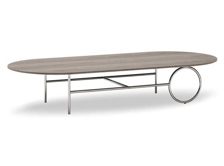 由正交线定义的轻金属结构的设计被大环打断,放置在不同的位置。除了打破轮廓的几何规律性外,圆形,取决于桌子的大小,成为连接或支持元素。眼睛被光环中心的空虚所吸引,产生了空间和轻盈的效果。