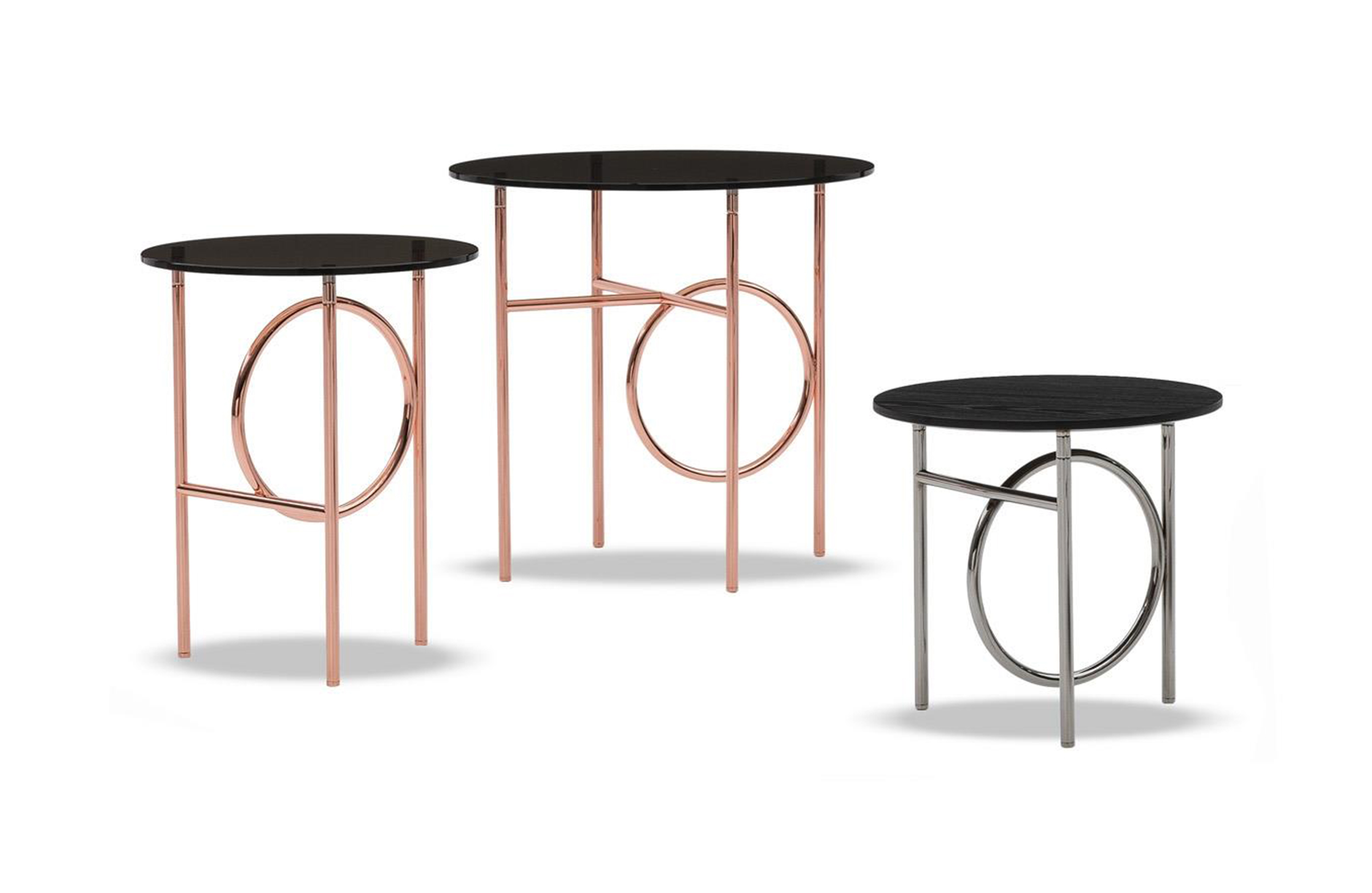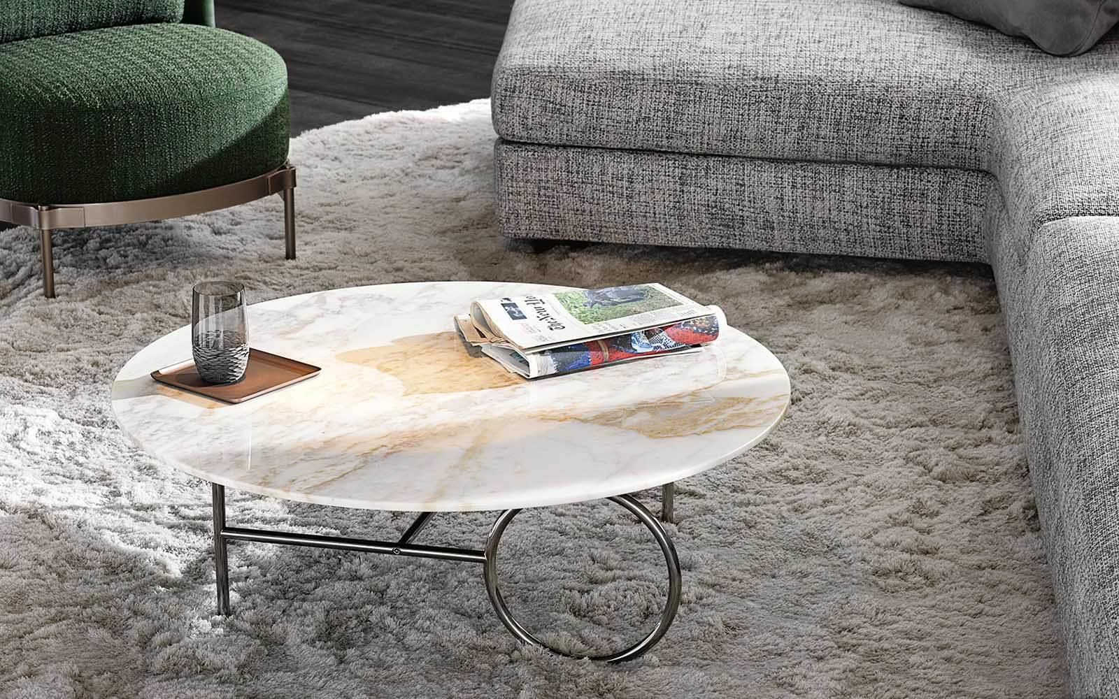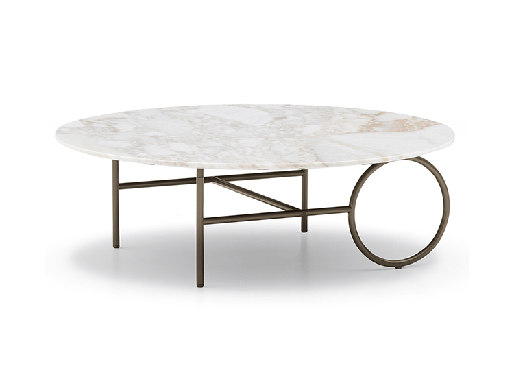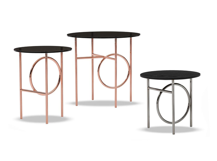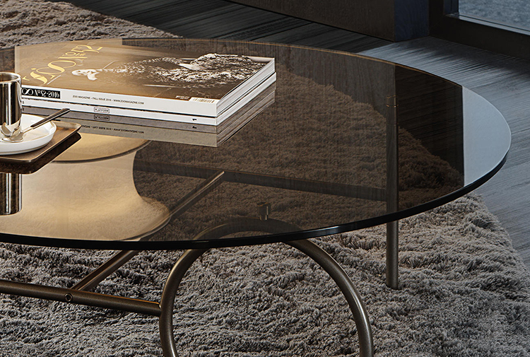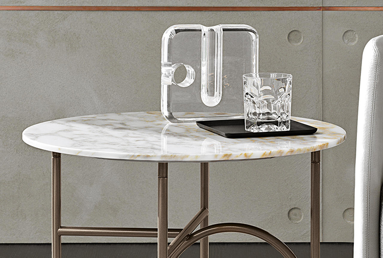 这种金属框架,有轻青铜、铜或黑镍,有不同的高度。圆桌由椭圆形或圆形顶部完成,直径不同,可在青铜玻璃、卡拉卡塔大理石或甘草刷灰中定制。