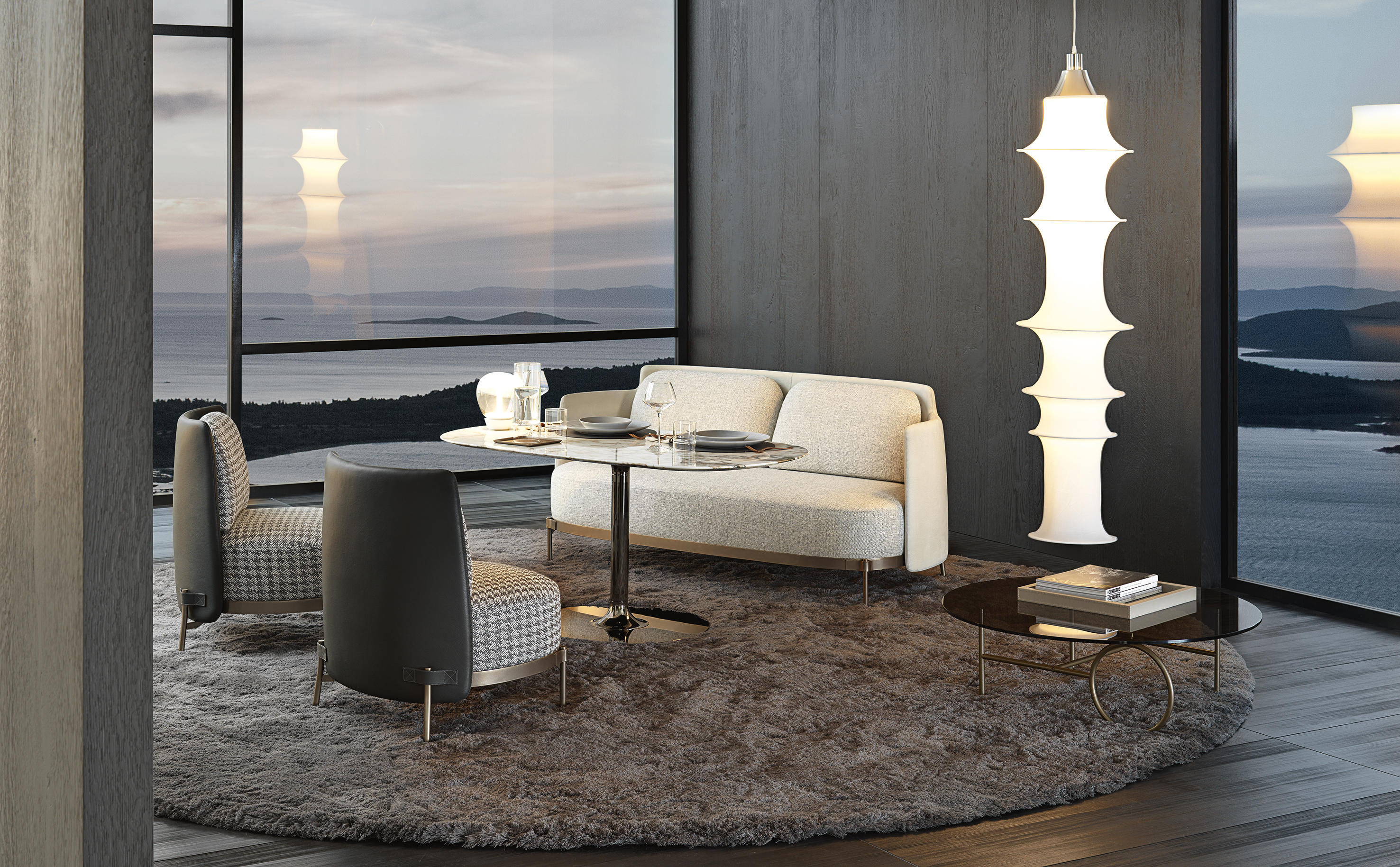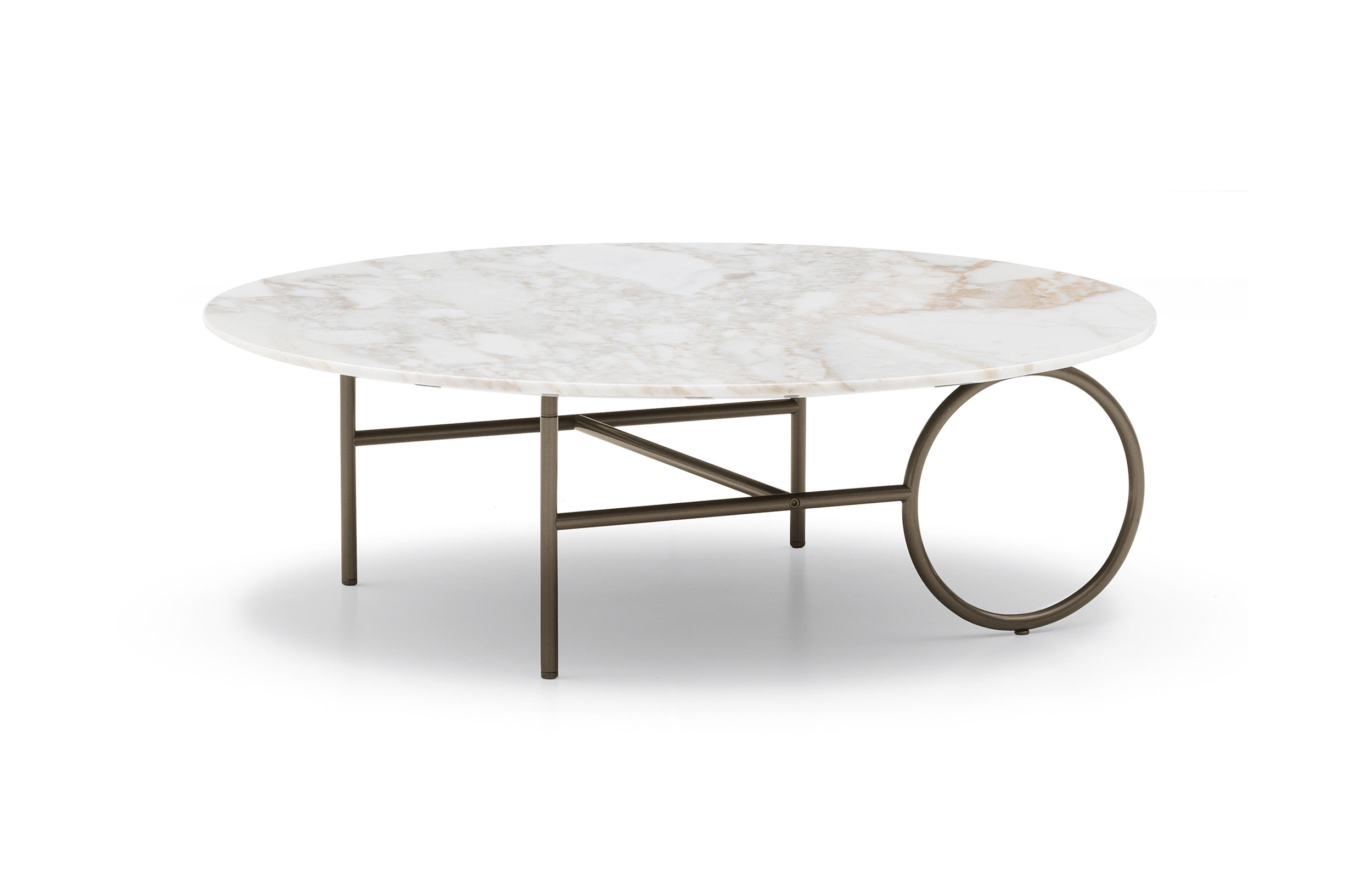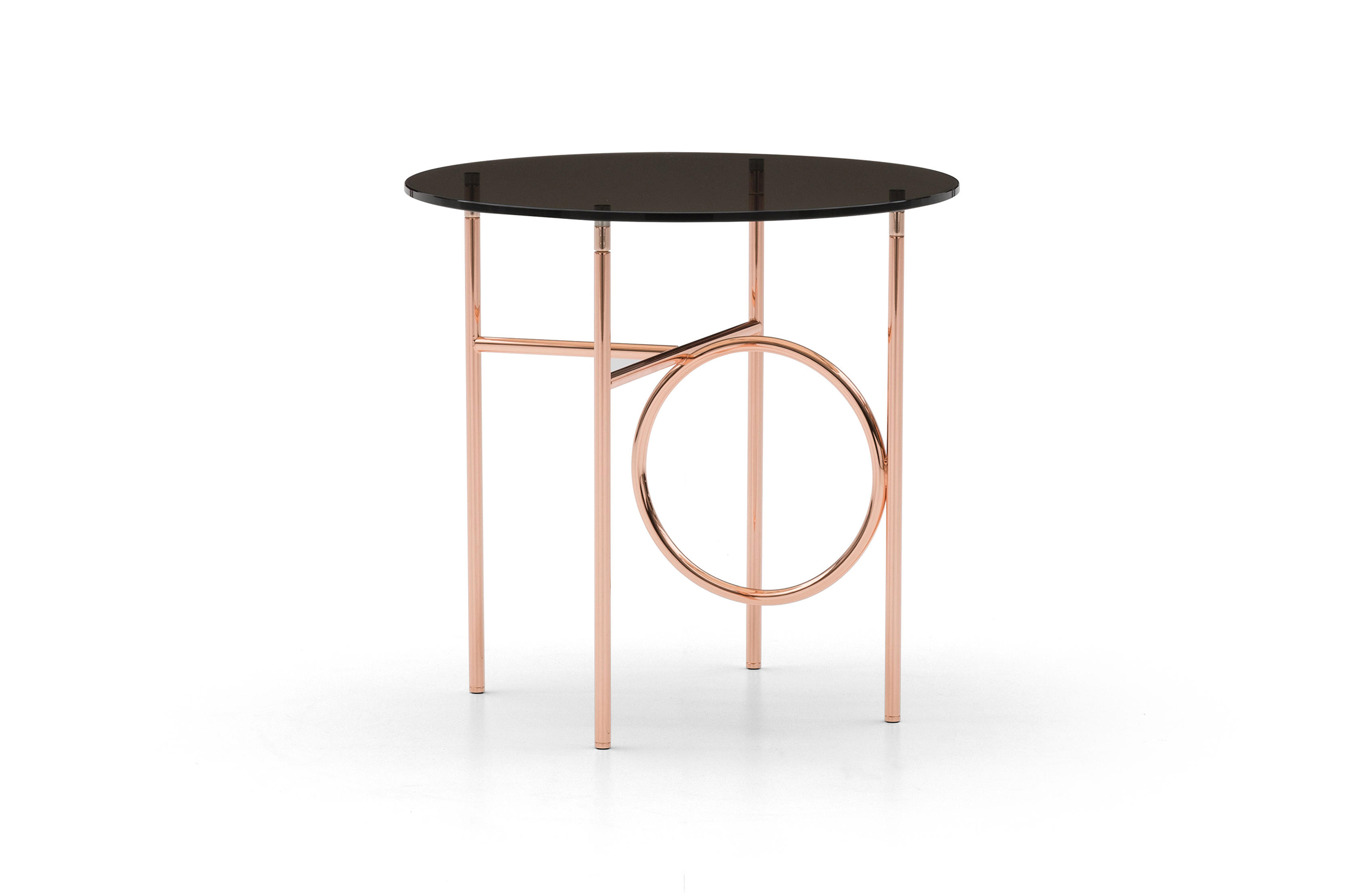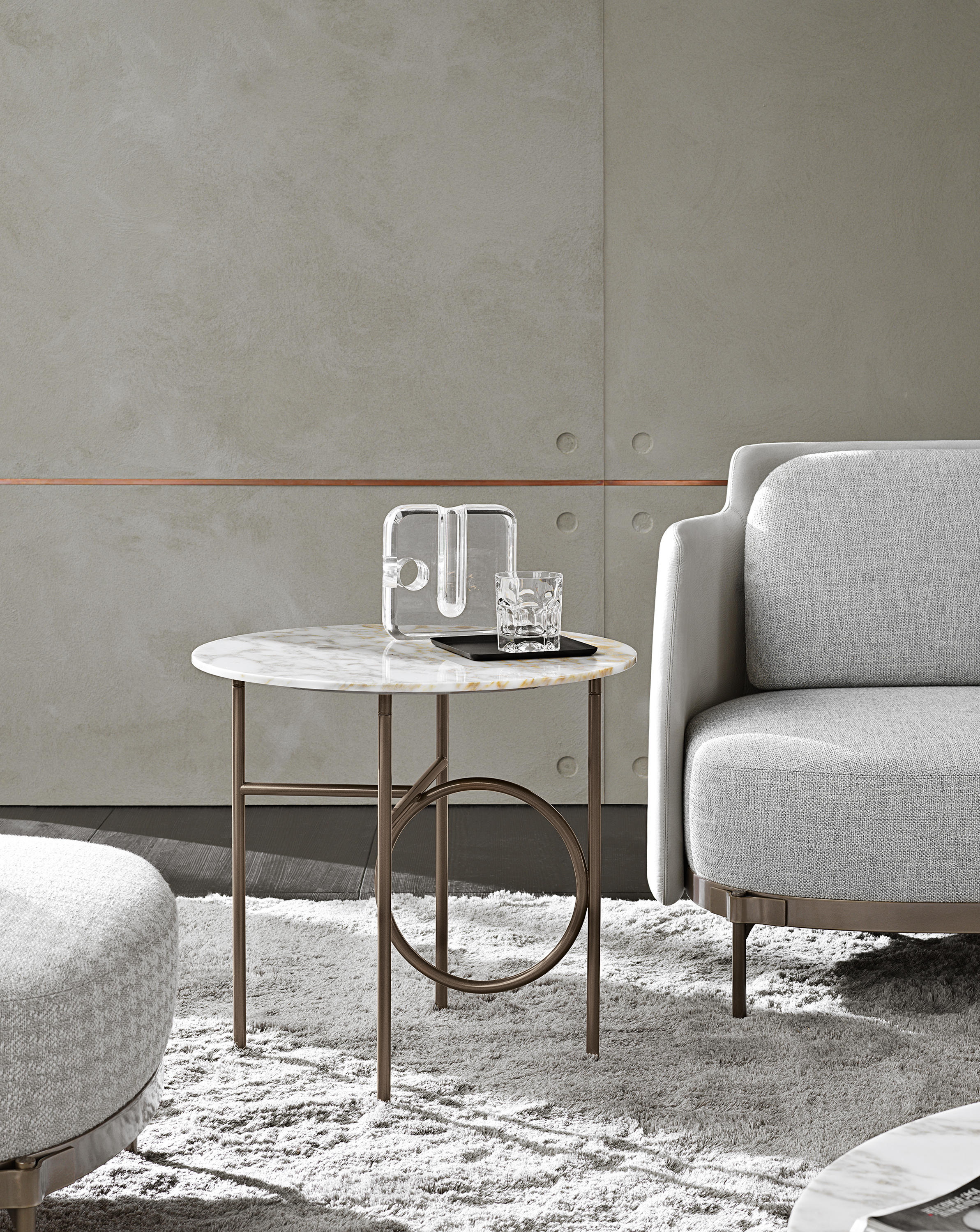 这种金属框架,有轻青铜、铜或黑镍,有不同的高度。圆桌由椭圆形或圆形顶部完成,直径不同,可在青铜玻璃、卡拉卡塔大理石或甘草刷灰中定制。