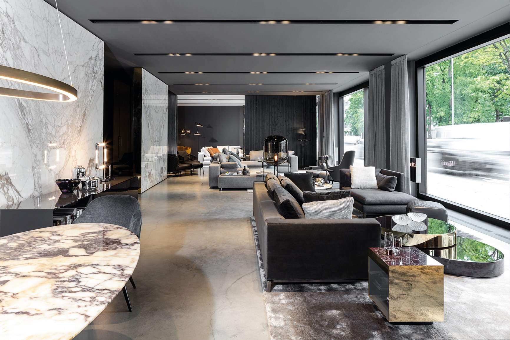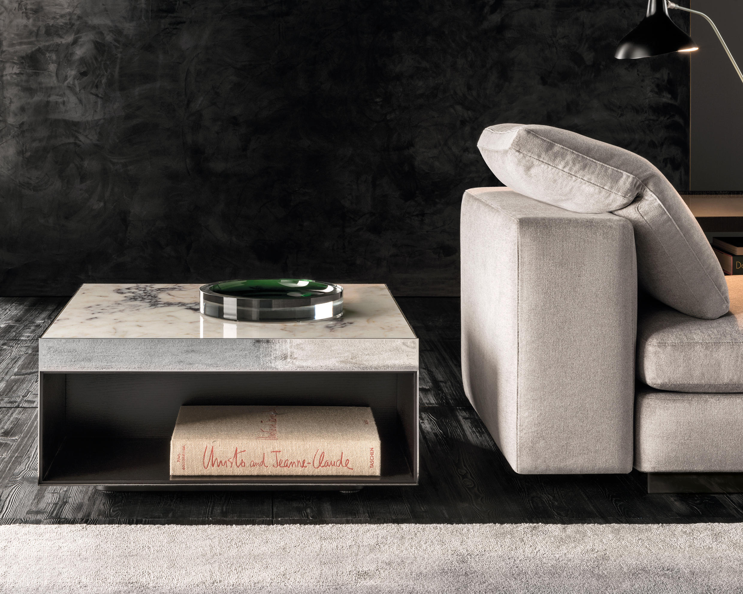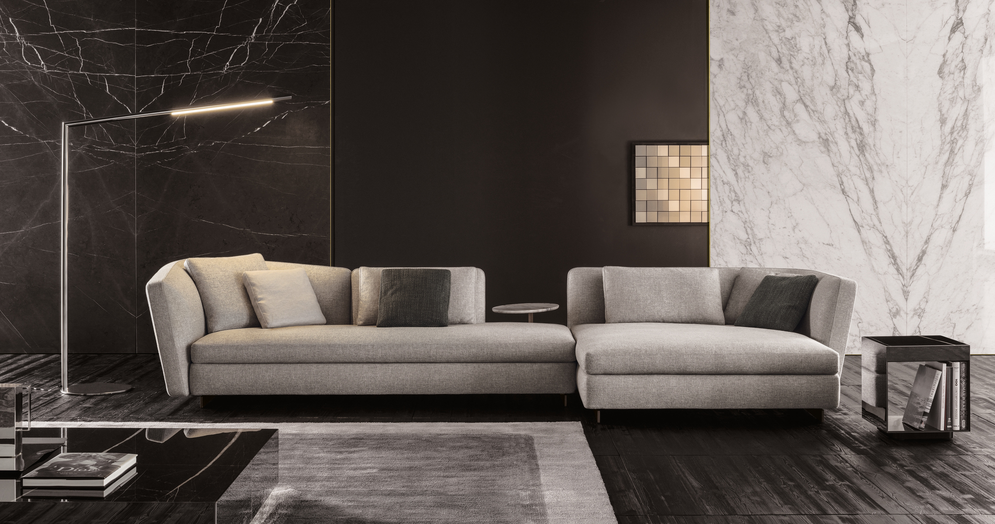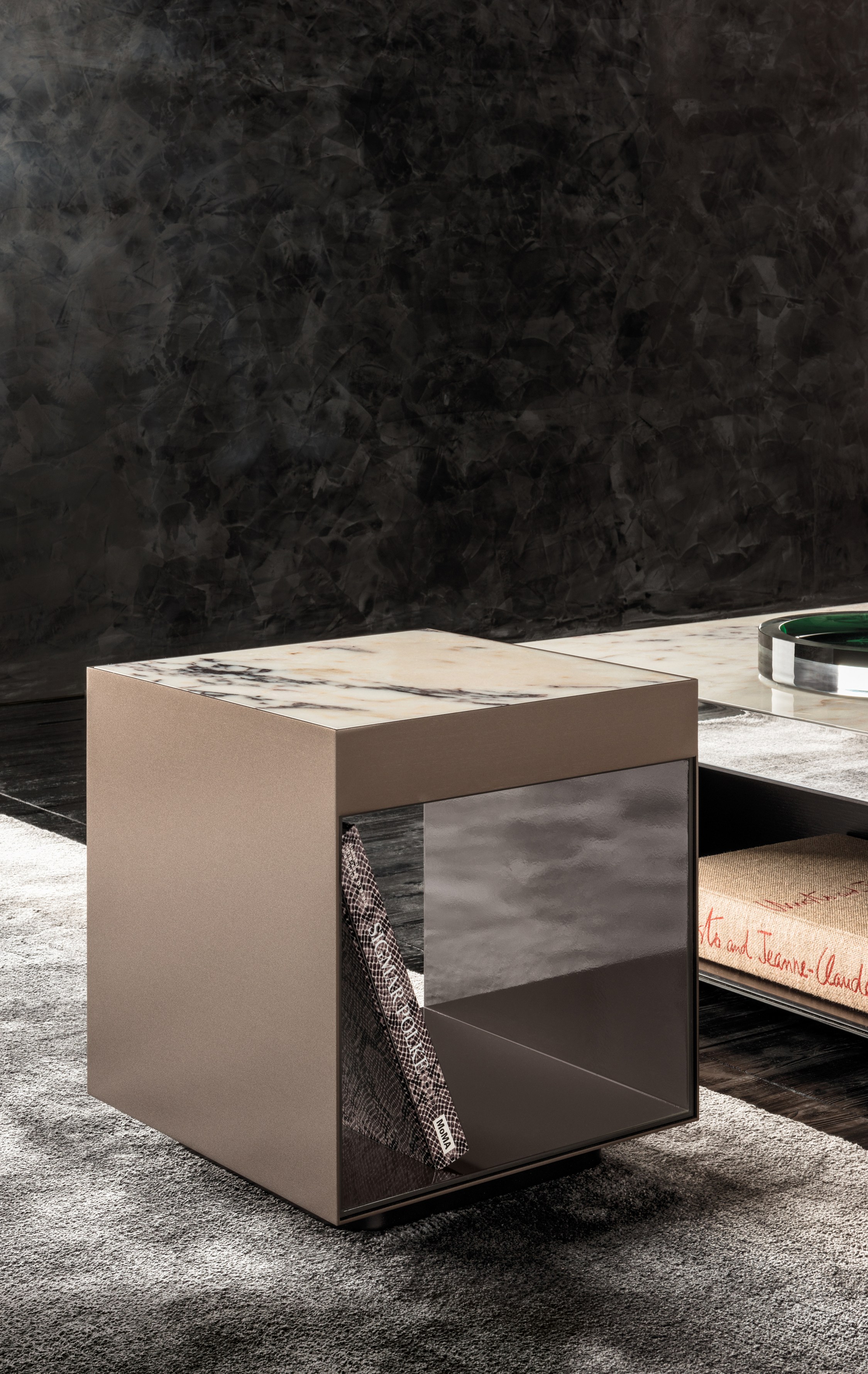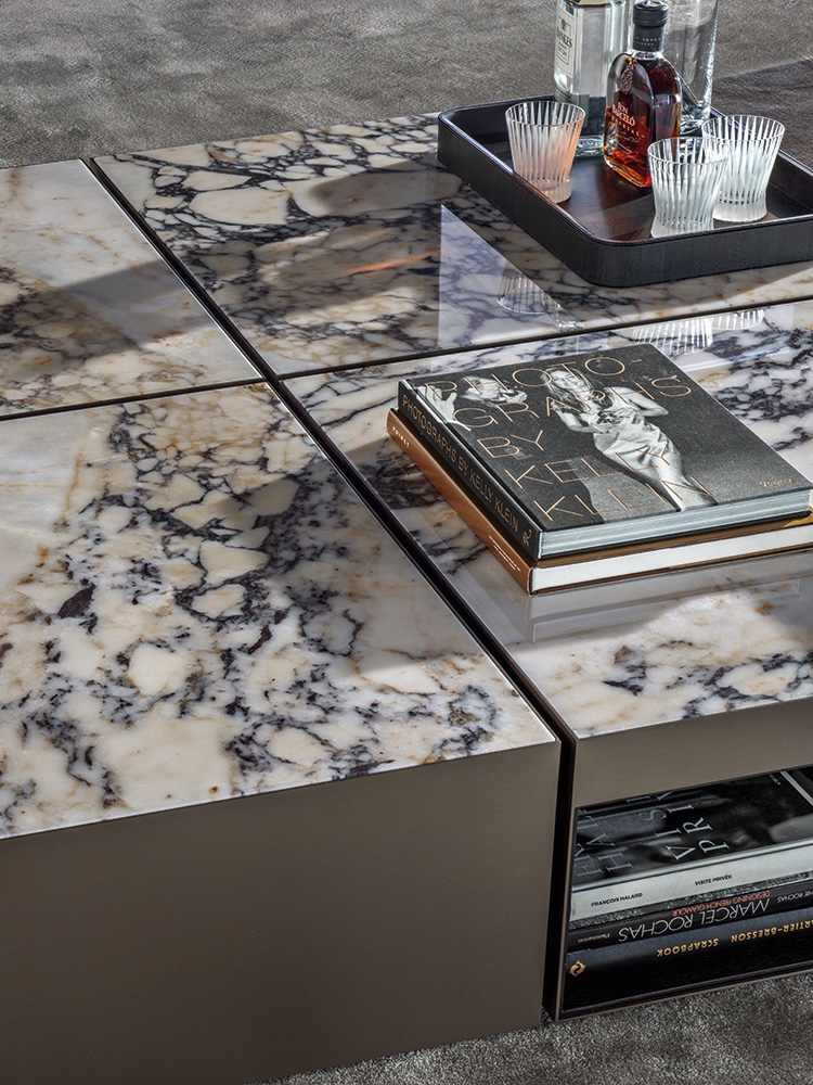这是用于收纳贵重物品的边几系列,拥有纯粹而简洁的美学设计,有着精美绝伦的多种材质组合。这一边几家族拥有华贵的美学特质,因而也有着非同一般的功能,在提供实用置物表面的同时,呈现精美的装饰效果,具有50年代和60年代的米兰设计风格。金属构架的表面有亮铬色、亮金色和亚光铜色,嵌入构架的台面可谓画龙点睛,选用多种珍稀的大理石材质,其中包括Arabescato Purple、Sahara Noir和Rosso Levanto,或是Moka色的白蜡木、Moka色橡木。从建设性的角度来看,Elliott边几的内部储物空间可以用于摆放杂志或其他物件,有花岗石色的亮面漆或Moka色开孔橡木可供选择。金属材质的外部框架搭配包覆木质的内部框架,以此可以看出工艺的复杂性,同时平添一份温暖的质感,展现Elliott边几的名贵特质。
