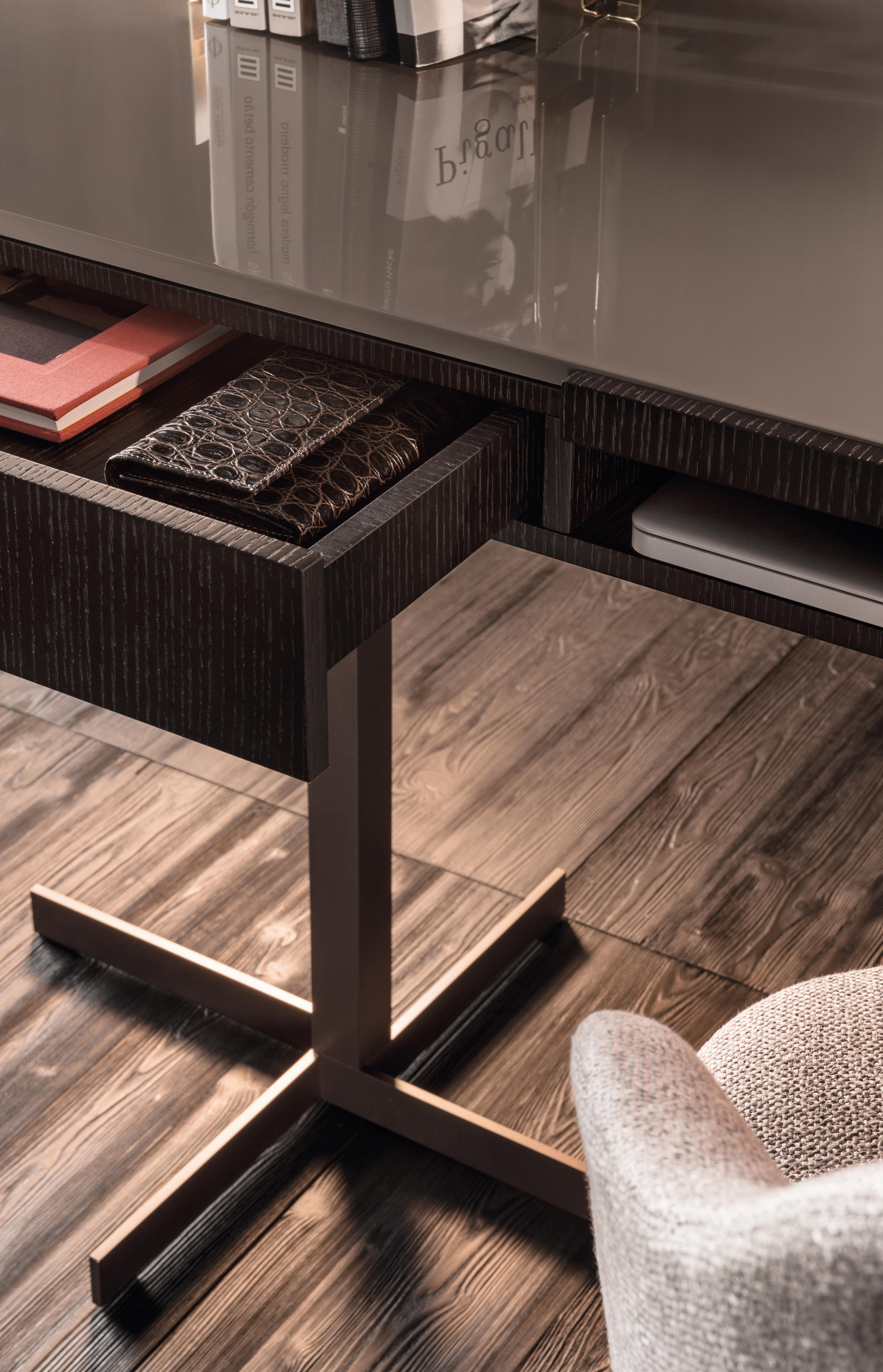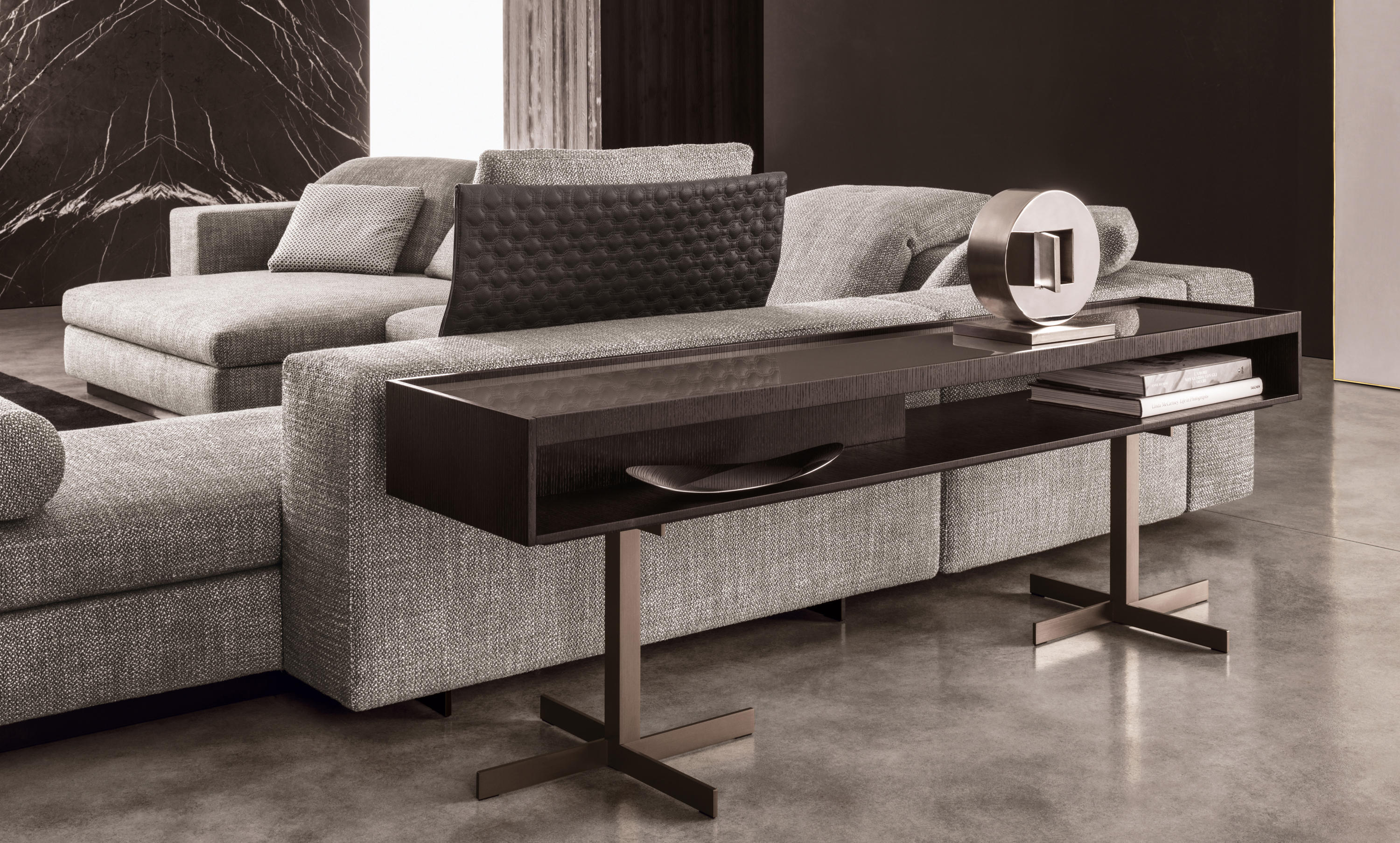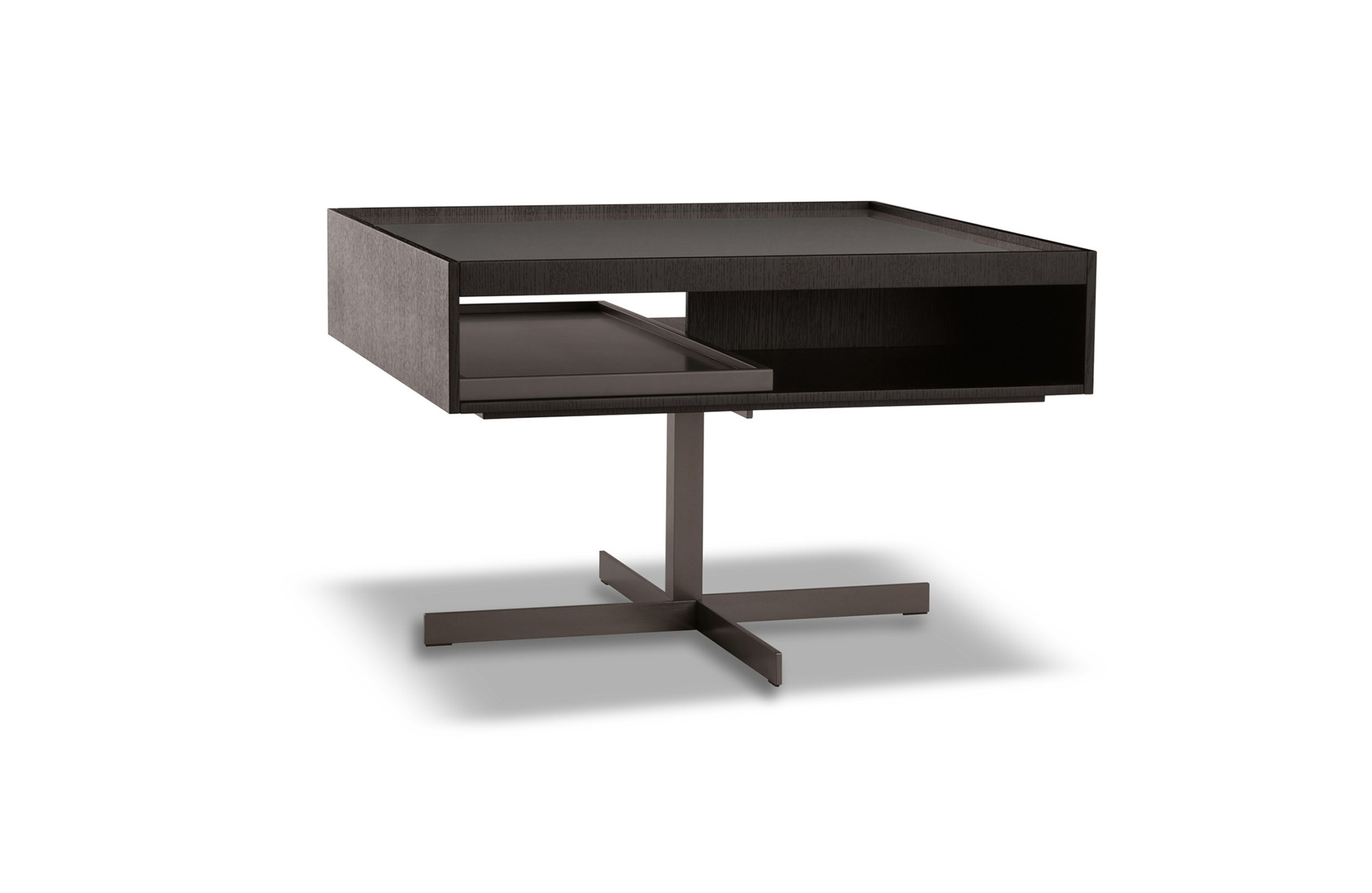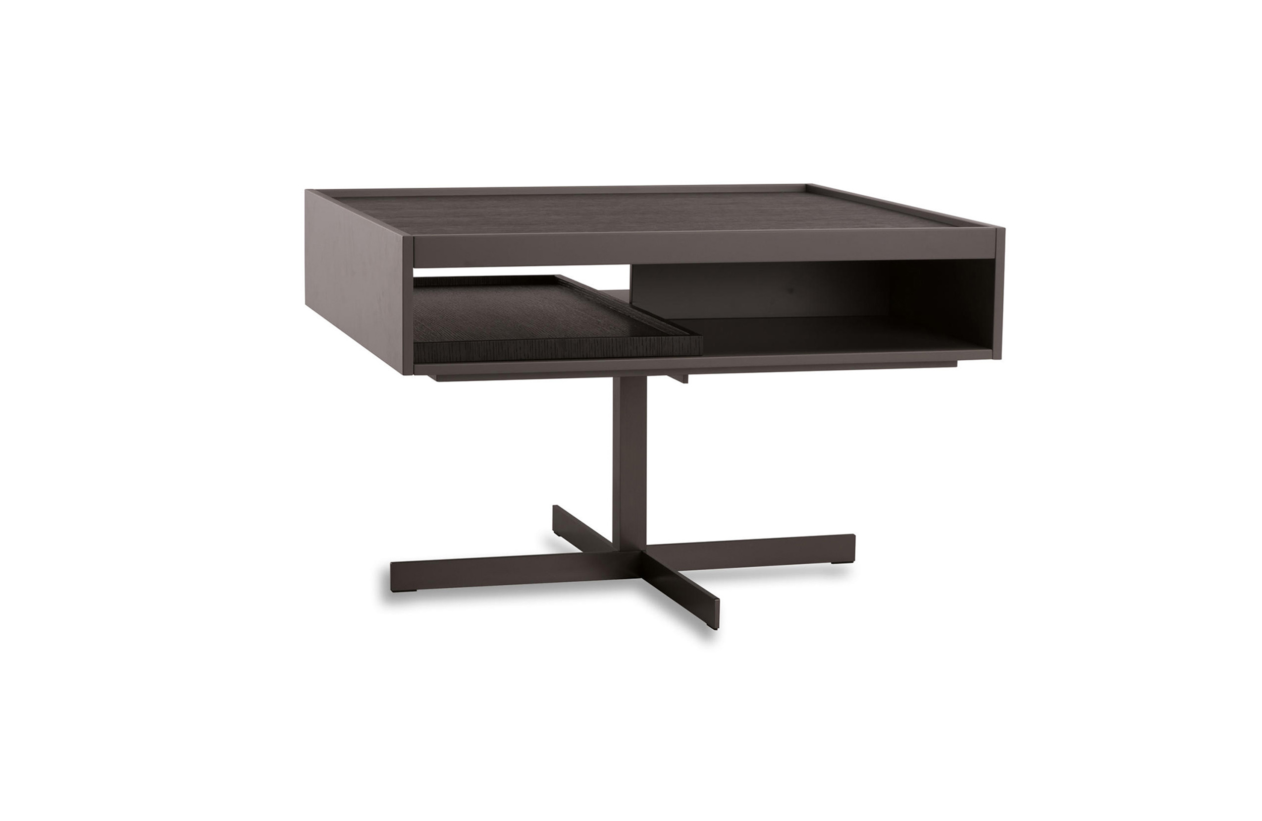 克洛塞边几特别为搭配Yang沙发系列而设计,拥有实用的置物表面和收纳空间。Close边几的理想位置可以是在靠背椅和Yang沙发之间,提供使用的置物表面:每件要用的物品近在咫尺,或是整齐地摆放在下方的收纳空间中,您可以在沙发上尽享放松时光。基座采用十字的简洁造型,采用金属制成,搭配亚光铜色表面。上方部分的置物空间采用前后皆可用的开放式设计,并且搭配一个可取下的托盘,有两个版本可供选择:一种是构架为Moka色漆面的开孔橡木,上方面板为粘土色亮光漆,内部的托盘为粘土色亚光漆;另一种是构架为粘土色亚光漆,上方面板和内部托盘为Moka色漆面的开孔橡木。除了不同尺寸的边几以外,Close系列还包括边柜、写字台和床头柜。