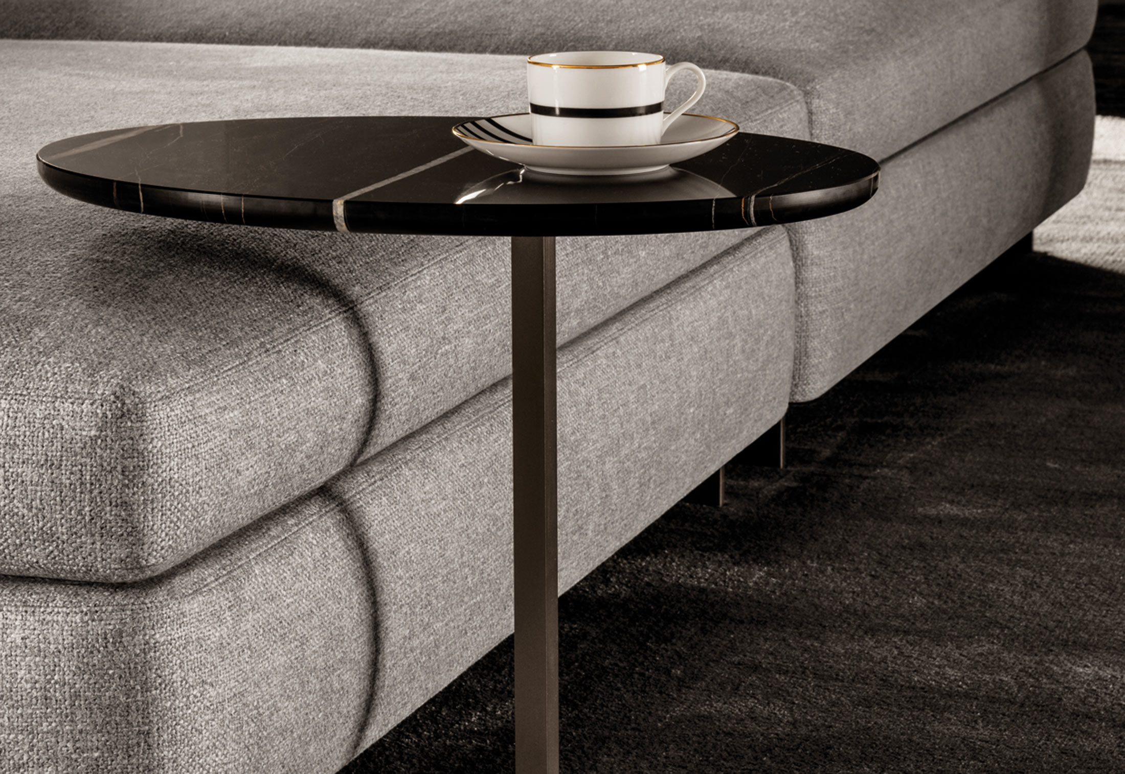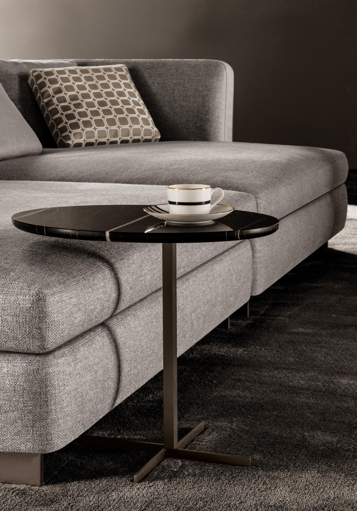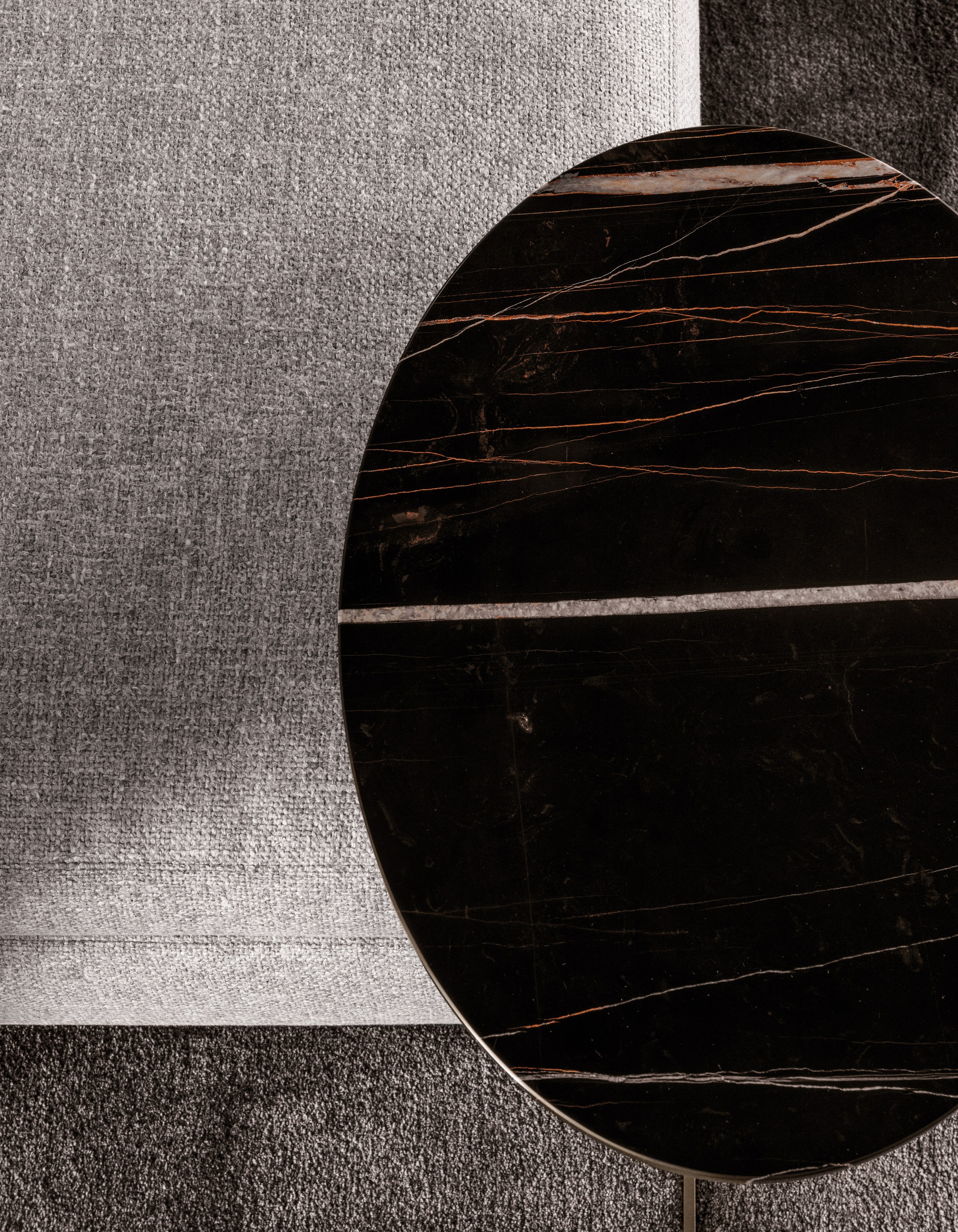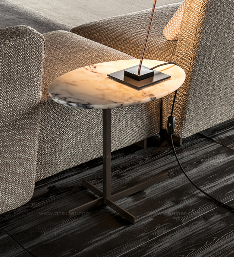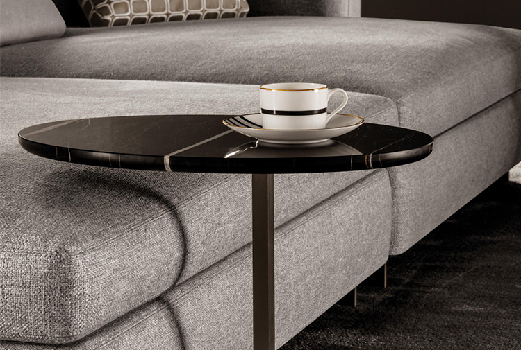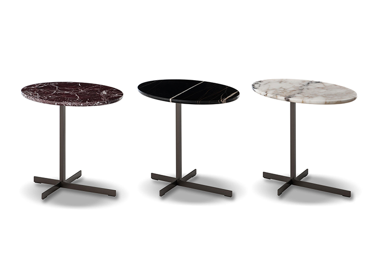这款边几是专为搭配最新沙发座椅系列而设计的万能单品,基座为造型严谨的金属材质,台面为珍贵的大理石。Joy边几推出全新版本,采用椭圆形的大理石台面,与基座一同打造出不对称的效果,因而Joy “Jut Out”边几尤其适合搭配全新系列的沙发座椅。基座为十字形支撑,采用铜色金属材质。Joy “Jut Out”边几的台面采用圆边设计,还可以选用名贵的大理石材质:Arabescato Purple、Sahara Noir、Rosso Levanto,全部为抛光表面。