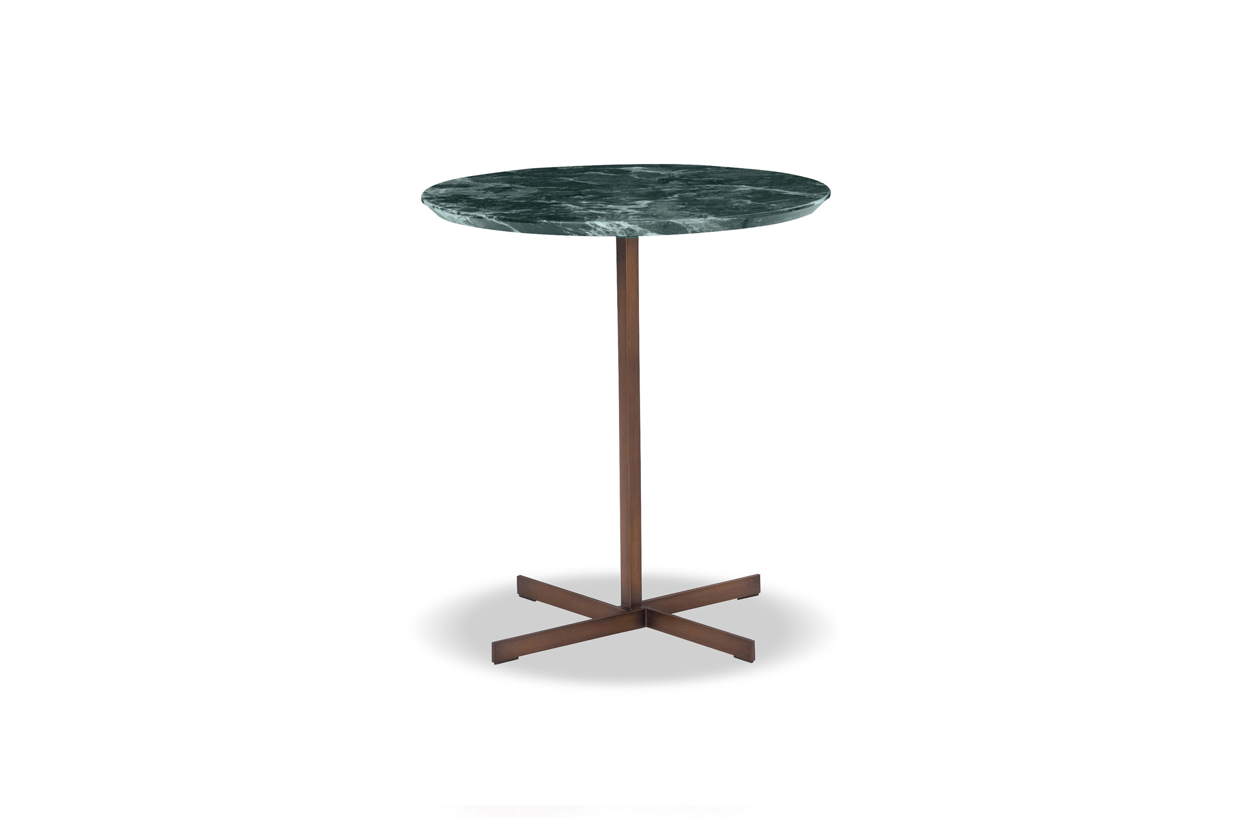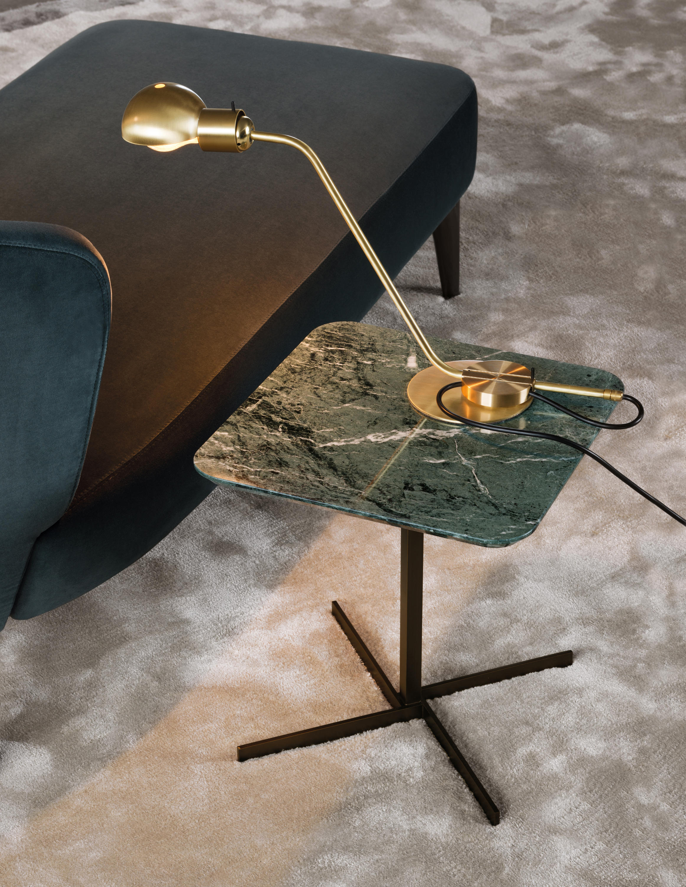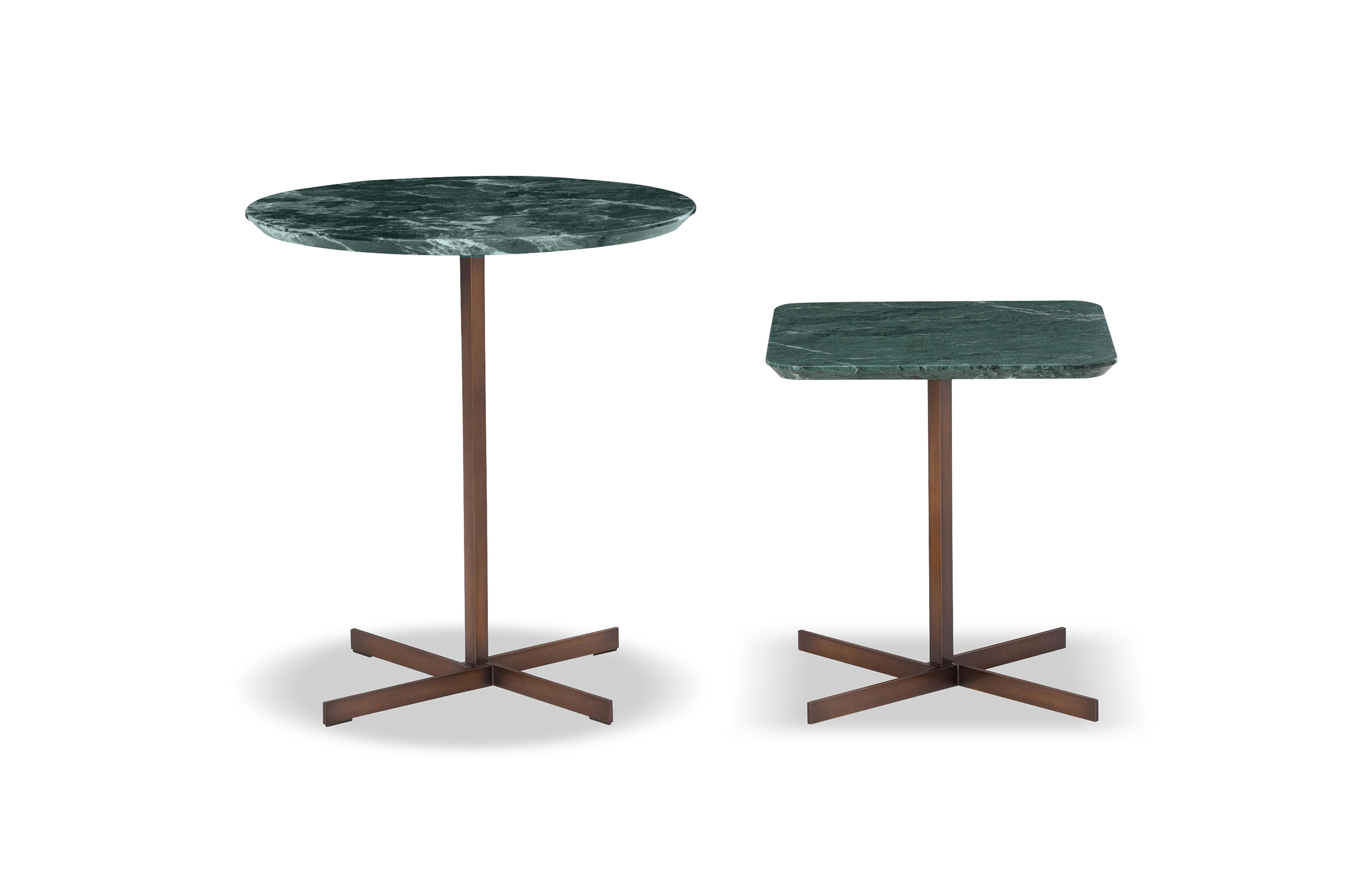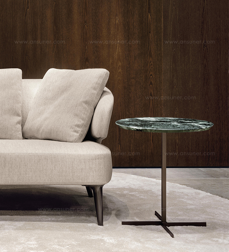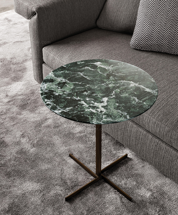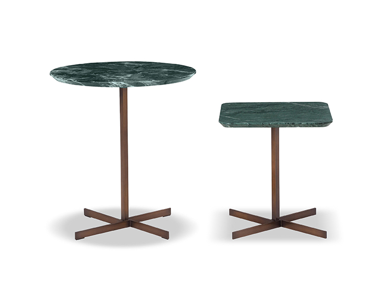 这一系列的产品用简洁的造型来搭配珍贵的材质,比如带有绿色调的Issogne大理石,台面采用斜切边缘的设计。地面支撑为金属材质,漆面为铜色,采用十字造型。Joy是一款可以搭配新系列中所有沙发座椅的边几,就造型而言,有高度为55厘米的圆形和高度为41厘米的正方形可供选择。