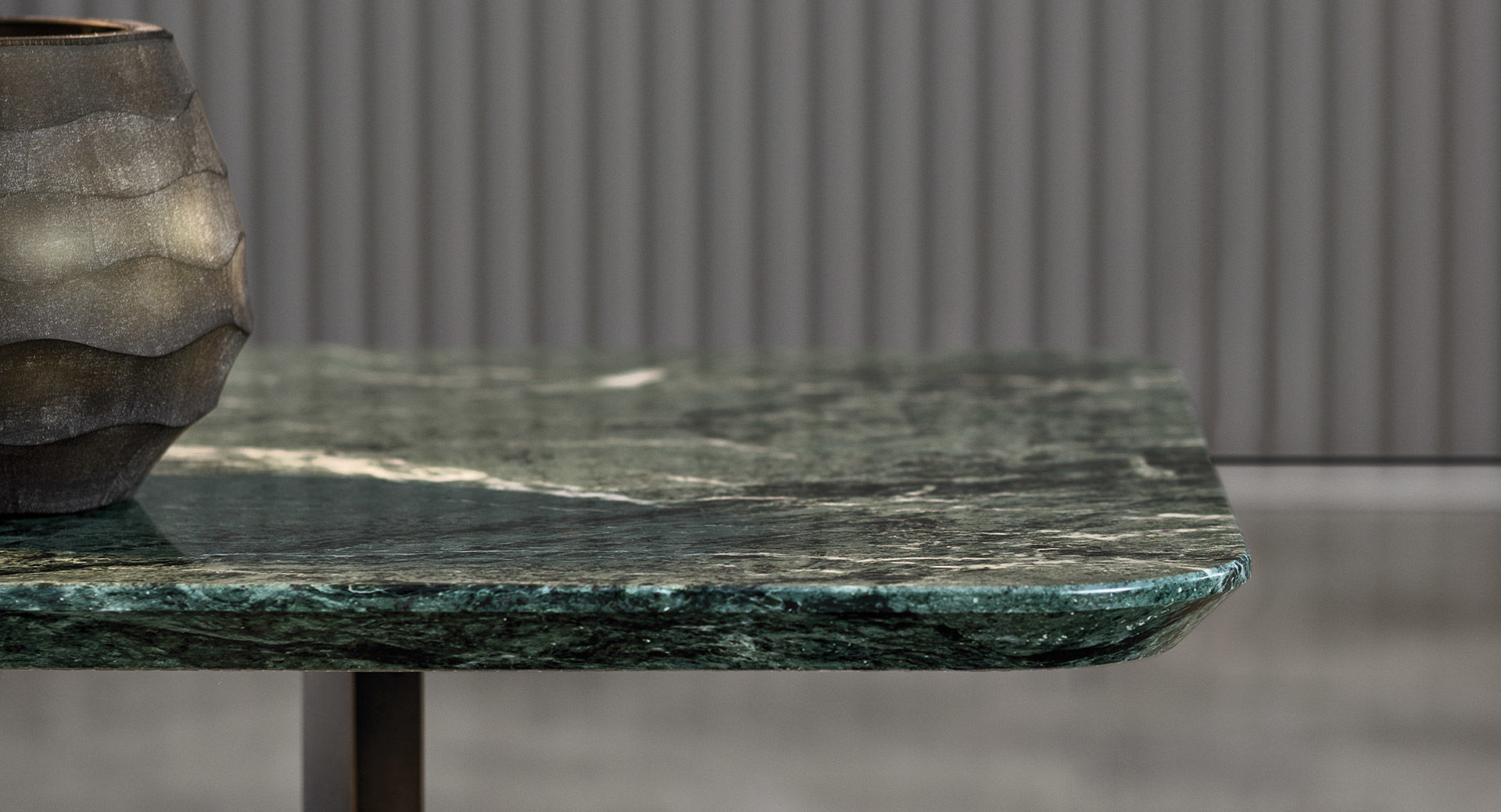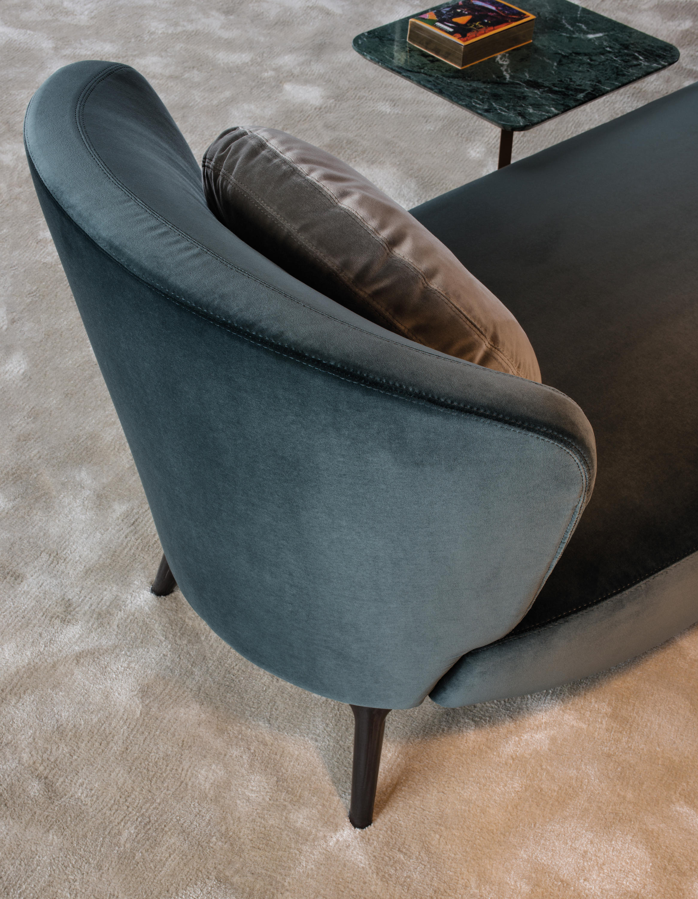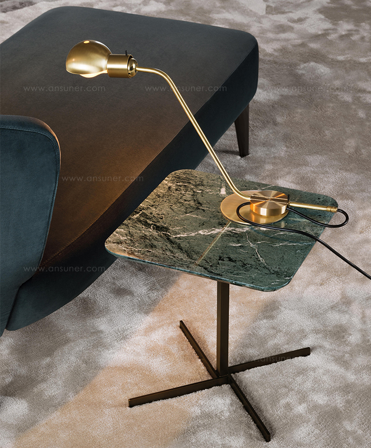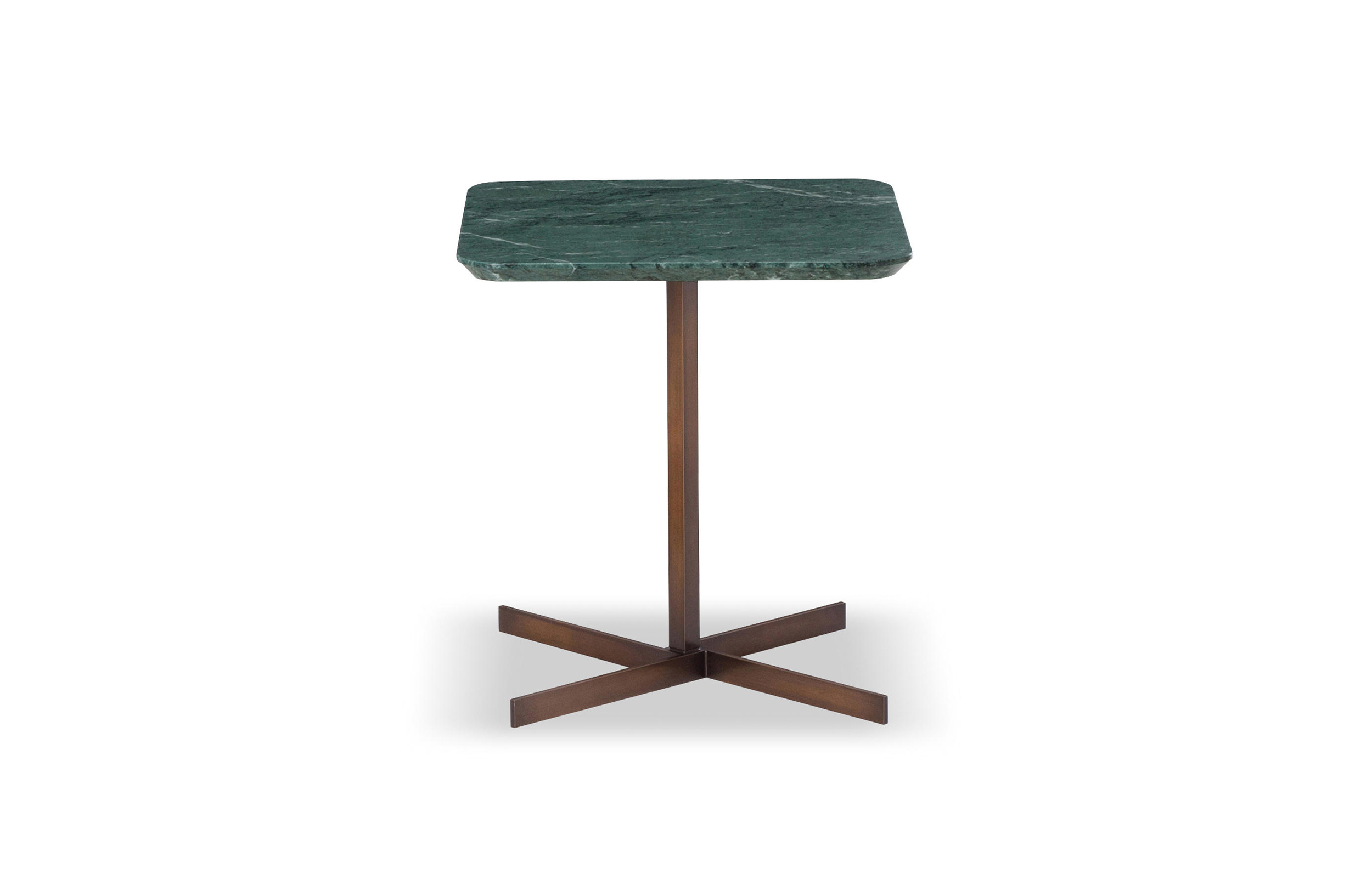 这一系列的产品用简洁的造型来搭配珍贵的材质,比如带有绿色调的Issogne大理石,台面采用斜切边缘的设计。地面支撑为金属材质,漆面为铜色,采用十字造型。Joy是一款可以搭配新系列中所有沙发座椅的边几,就造型而言,有高度为55厘米的圆形和高度为41厘米的正方形可供选择。