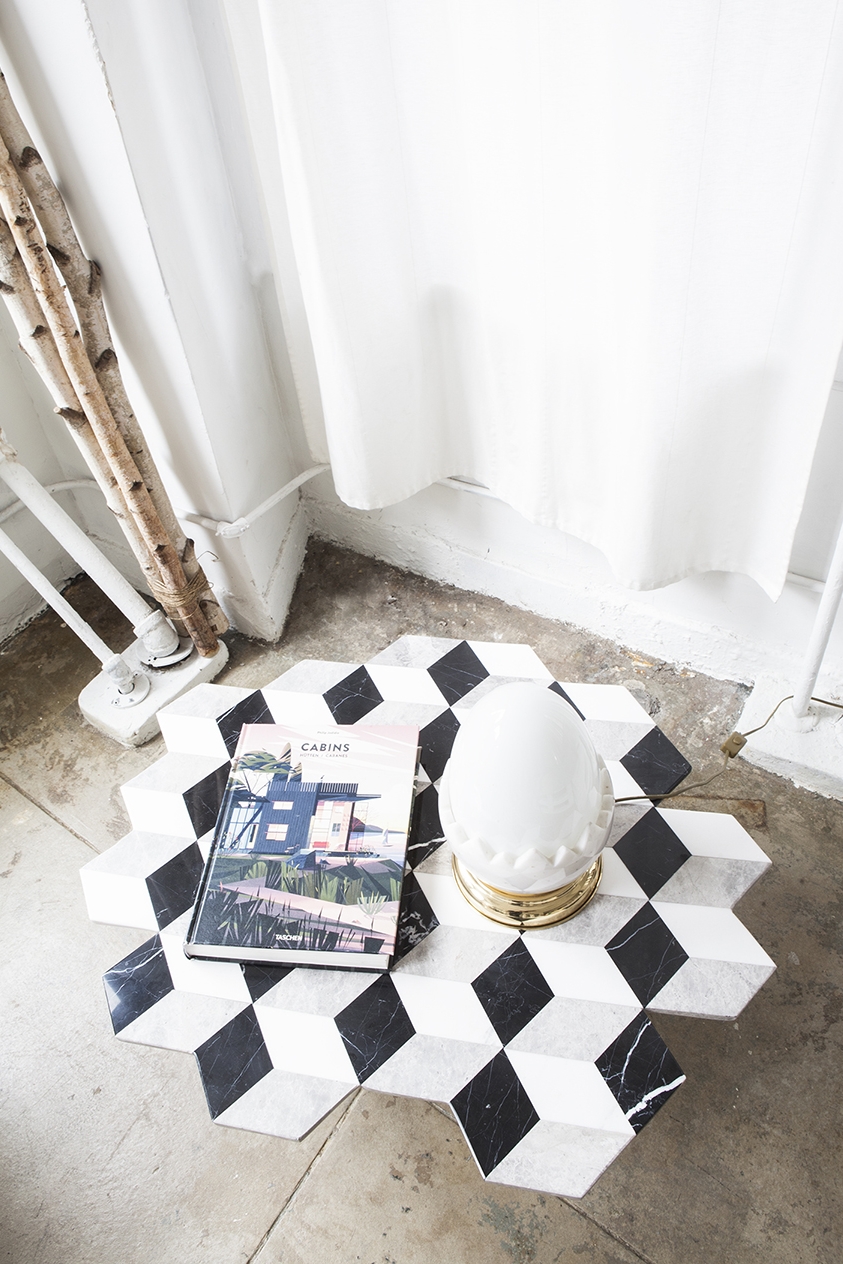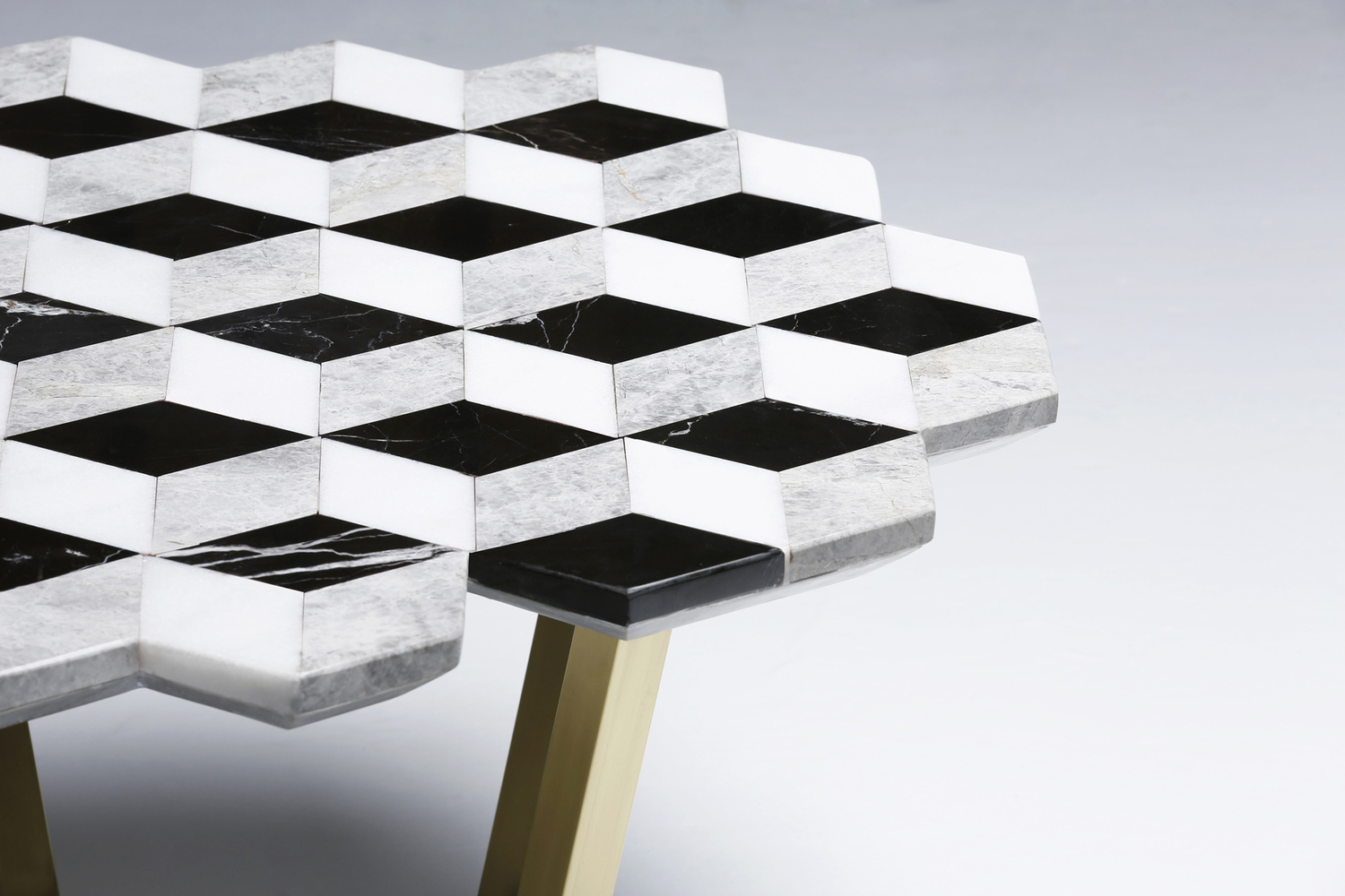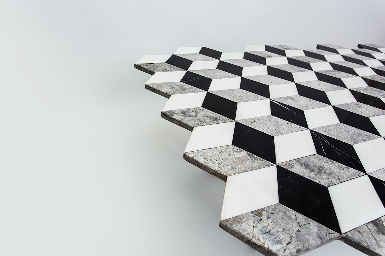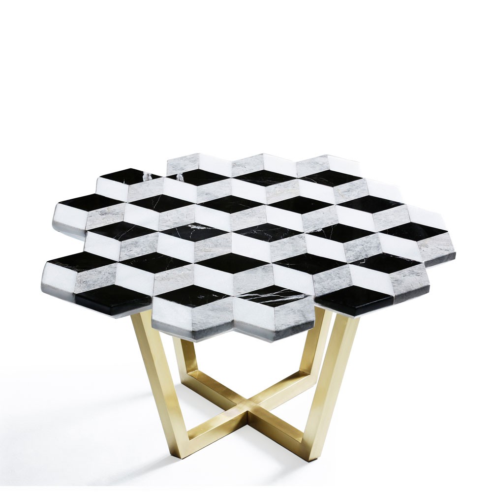 复视咖啡桌(Diplopia coffee table)是从创建一个传达视觉错觉的物体的想法中构思出来的。通过组合不同种类的大理岩产生立体效应。大理石桌面的不对称形式增加了复视的幻觉。复色的单色和彩色版本是用抛光或未抛光的铜腿制成的。更大的尺寸可根据要求提供。