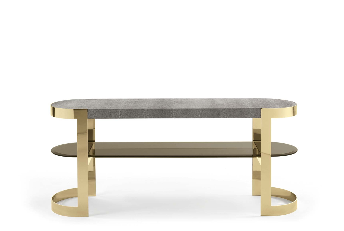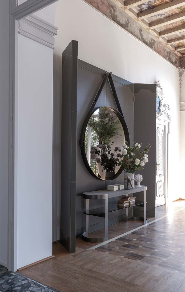 一种控制台,其基本轮廓将大理石或皮革与玻璃和金属相结合,以达到形式上的完美。