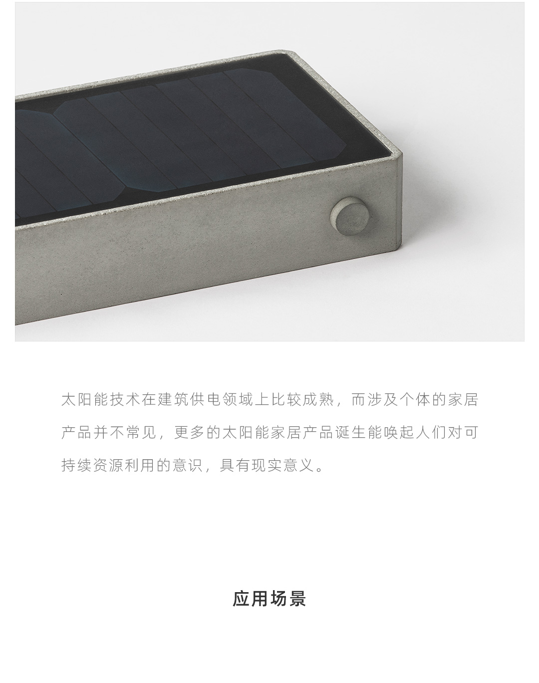 太阳光是最好的可持续能源。随着人对自然采光的心理诉求,无论是办公建筑或是住宅建筑的内部是越来越通透跟开阳,既节省了电力又增添了诗意。 一款无需插电,能在阳光充足的室内或者庭院区域使用的太阳能落地灯成为了可能。 太阳能技术在建筑供电领域上比较成熟,而涉及个体的家居产品并不常见,更多的太阳能家居产品诞生能唤起人们对可持续资源利用的意识,具有现实意义。
