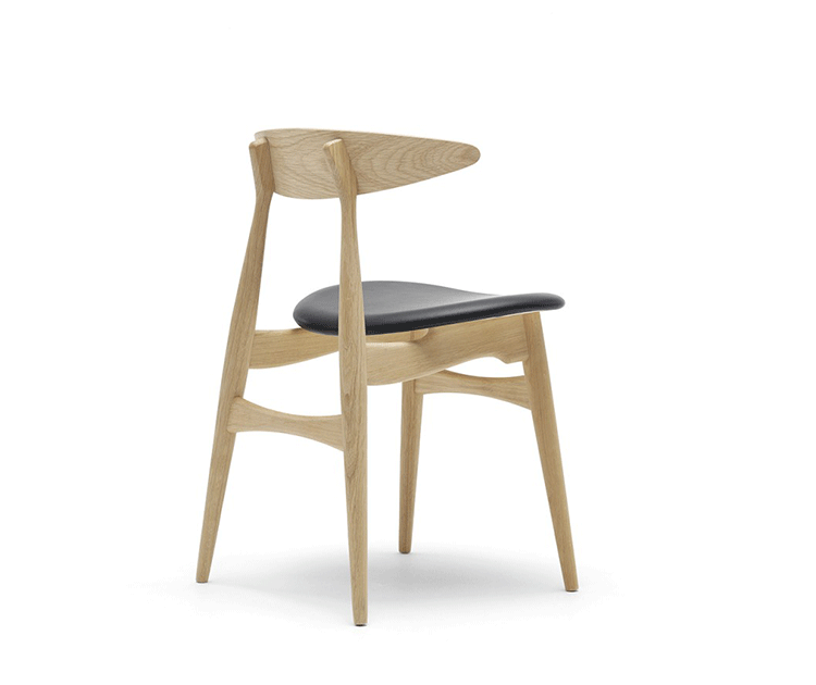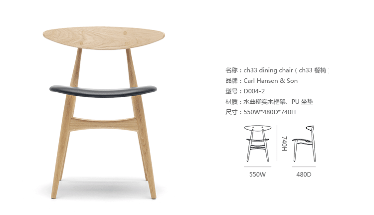 CH33 dining chair(ch33餐椅)由Hans Wegner设计于1957年,是其总多经典座椅之一。CH33餐椅轻巧的同时兼顾了座椅舒适度的与坚固度。其拥有着50、60年代的简约线条,座垫部份可选择增加皮革或布料软垫.主体更可随意搭配指定木料款式。CH33餐椅餐椅不仅仅是一把椅子,它更像一件艺术品,无论用在任何环境都非常的优雅气质,精良的手工制作更使它推向经典,流行至今,产生了一代又一代的拥趸者。