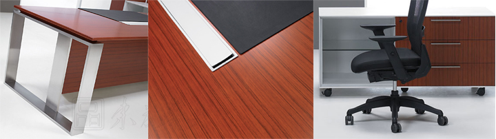 ※ 框型钢脚,配木质挡板,稳固性强,造形新颖。铝合金线盒,黑色皮垫,精致高档,配置复副侧柜样式如图,不锈钢系列面板选用欧洲枫木木皮,泰柚木皮,或淡雅,或热烈,柜桶面辅以砂纹灰,砂纹白素色薄边,使清逸与热烈得以沉稳,并结合不锈钢的刚冷光泽,溶合呈现后现代工业体系产品色彩风格!