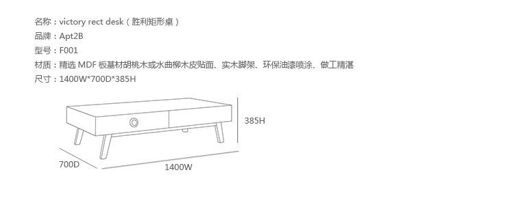 victory rect desk(胜利矩形桌)设计简单且牢固,且绝对华丽。设置有一个抽屉里还有一个开孔小空间,可以存放您你所有的东西。制作采用精选MDF板基材胡桃木或水曲柳木皮贴面、实木脚架、环保油漆喷涂、做工精湛。