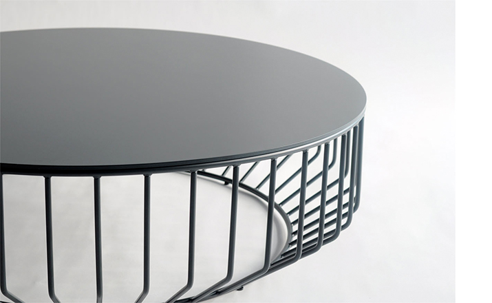 "Blending sloping angles and taut lengths of bent metal are a modern interpretation of the wiry idea initially conceived by Warren Platner.The series is made up of a suite of tables,side tables and benches and fitted with luxurious solid wood,glass,or upholstered tops.By choosing thenupholstered top the coffee table can serve as an ottoman."