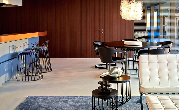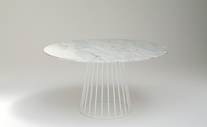 "Tapered lengths of metal meet with intention in a modern interpretation of the wiry idea initially conceived by Warren Platner.This compact cafe table with grand presence is suitable to be used in multiples or in smaller dining areas."