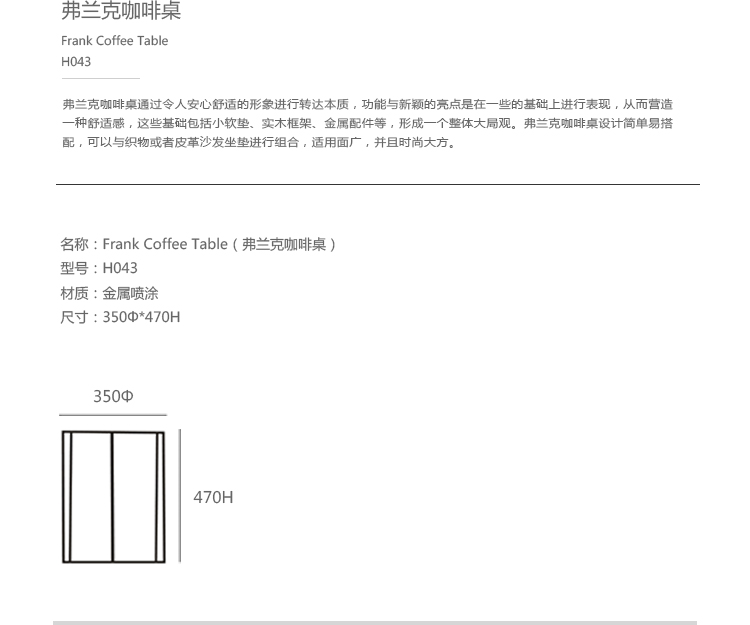 弗兰克咖啡桌通过令人安心舒适的形象进行转达本质,功能与新颖的亮点是在一些的基础上进行表现,从而营造一种舒适感,这些基础包括小软垫、实木框架、金属配件等,形成一个整体大局观。弗兰克咖啡桌设计简单易搭配,可以与织物或者皮革沙发坐垫进行组合,适用面广,并且时尚大方。