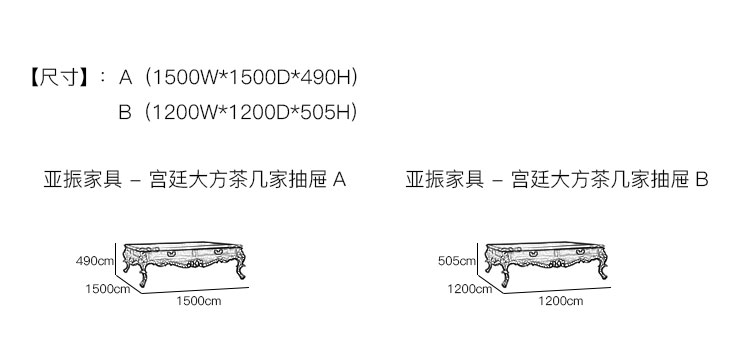 亚振家具 - 宫廷大方茶几家抽屉产品尺寸/示意图