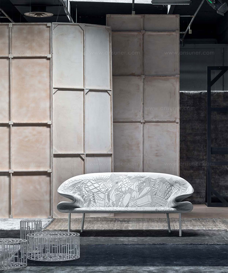从电话通话过程中无意识地进行涂鸦的手,思想的线条浮现出来。在电话中无意识地涂鸦的那只手,思想的线条浮现出来。单纯的思考经过累加的过程,无意识的笔触,涂鸦;一开始有一条直线,最后有一个完整的,复杂的部分。因此,刺绣。沙发的设计是由折叠的毯子做成的。座椅是精致的,深沉的思想,扶手是柔软的,沙发是欢迎的。家具上的绗缝遵循着涂鸦的线条。这是一个欢迎的想法,一个白日梦。
