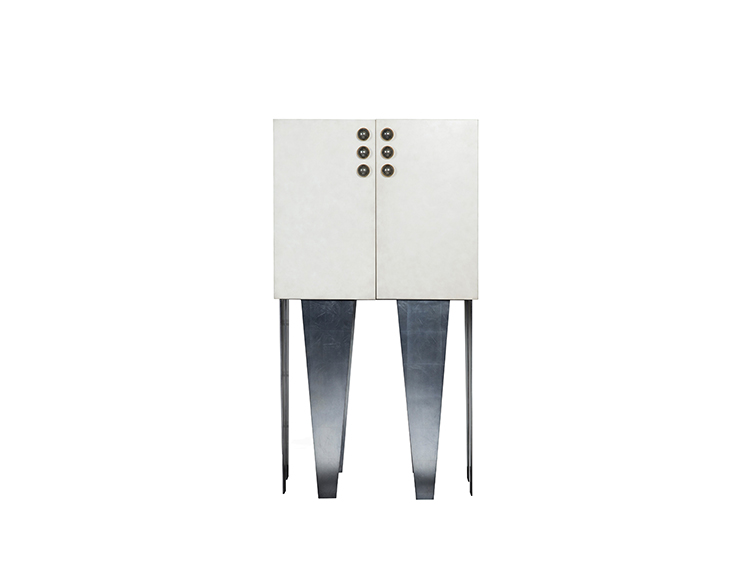 格里菲斯柜子装饰有手工挑选的半月形黄铁矿石,镶嵌在优雅的青铜框架中。 黑色或抛光的青铜色饰面交替出现,凸显了凯莉对混合金属色彩和原始自然细节的亲和力。 钢底座,羊皮纸外包装和天然胡桃木内部抽屉。