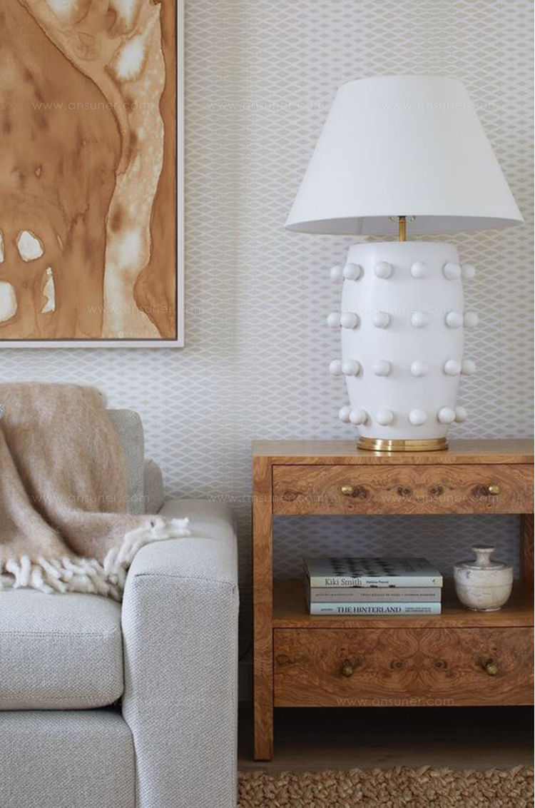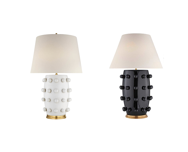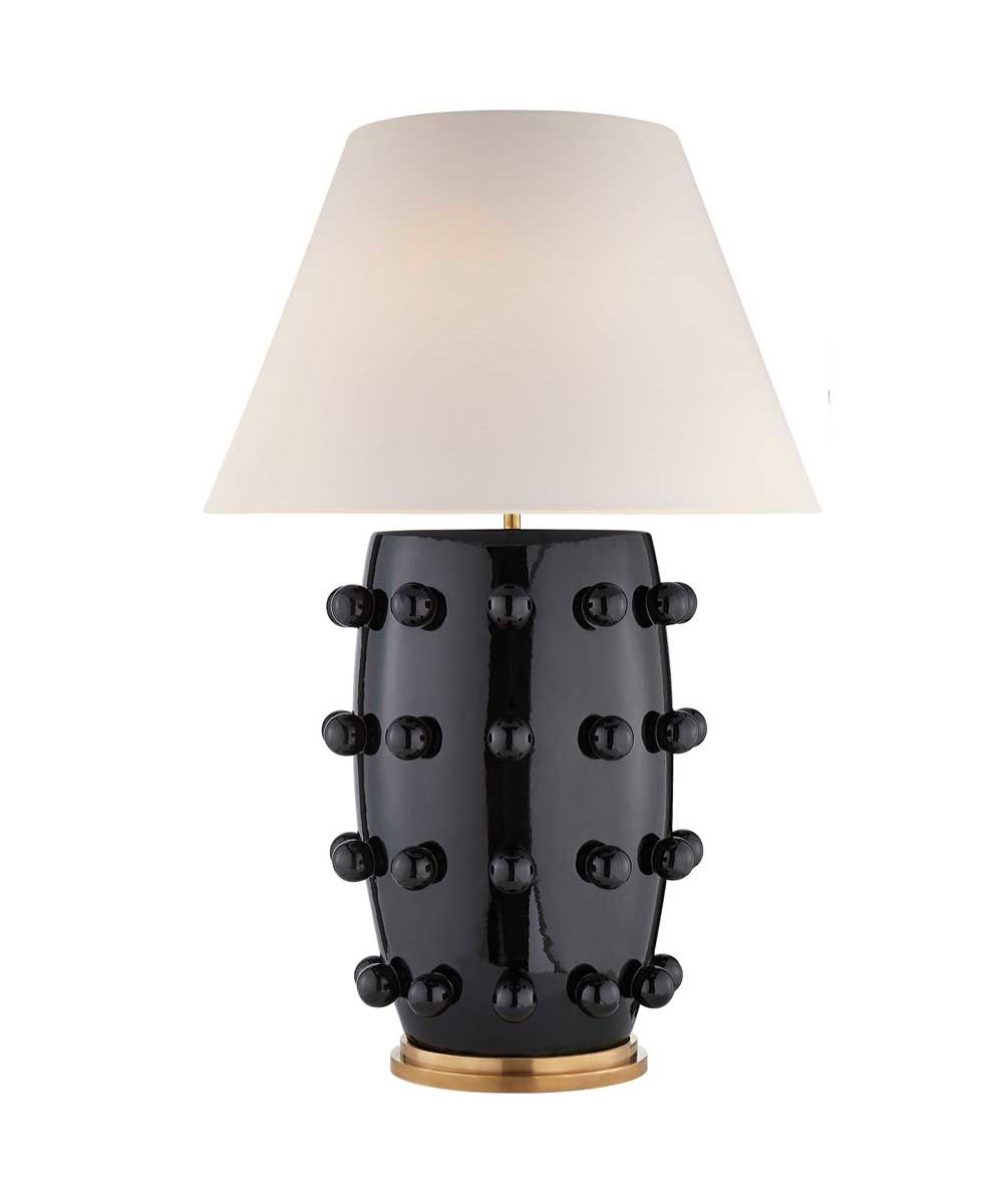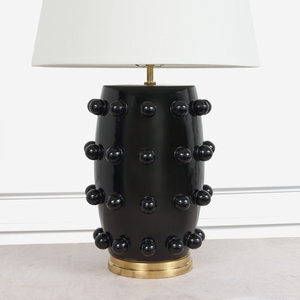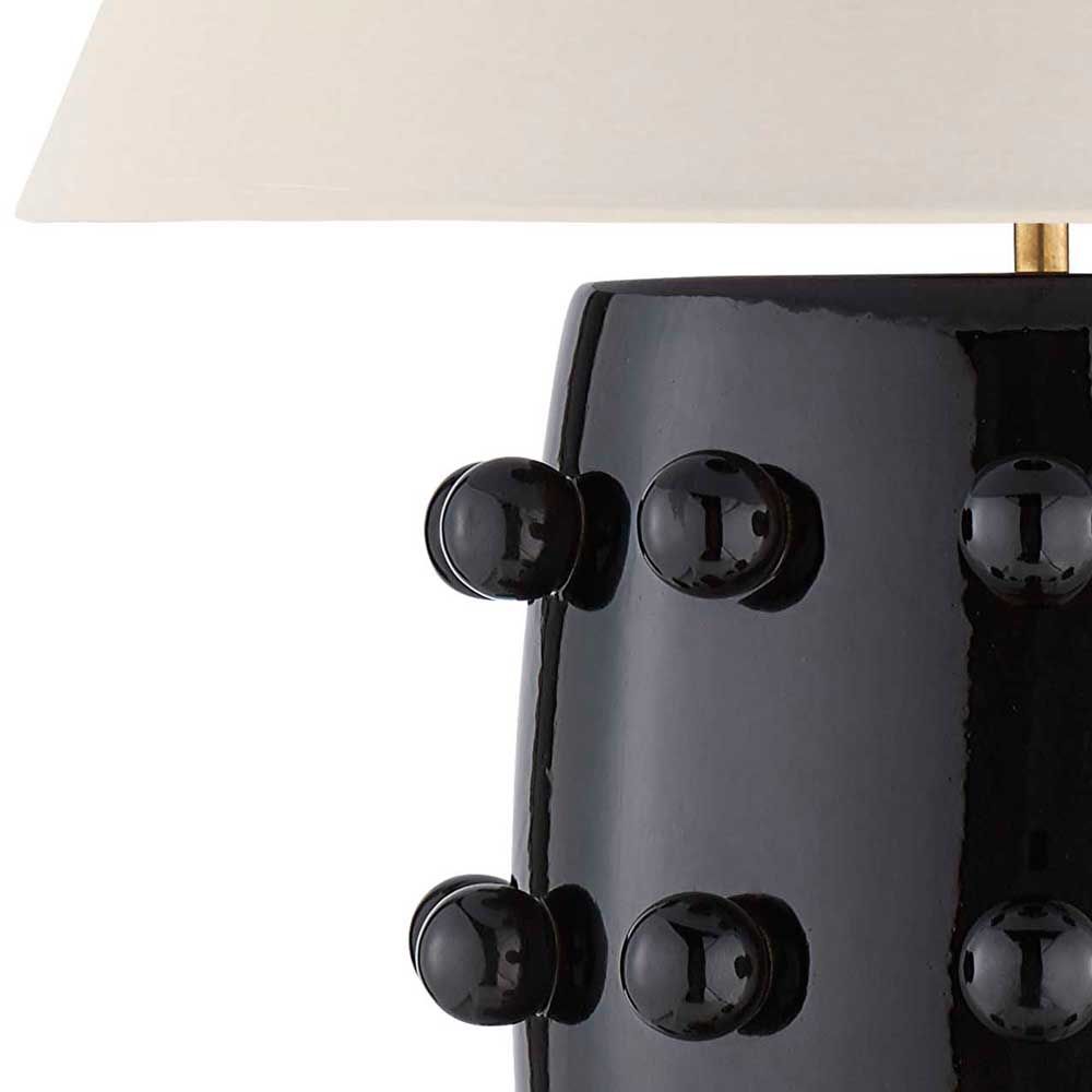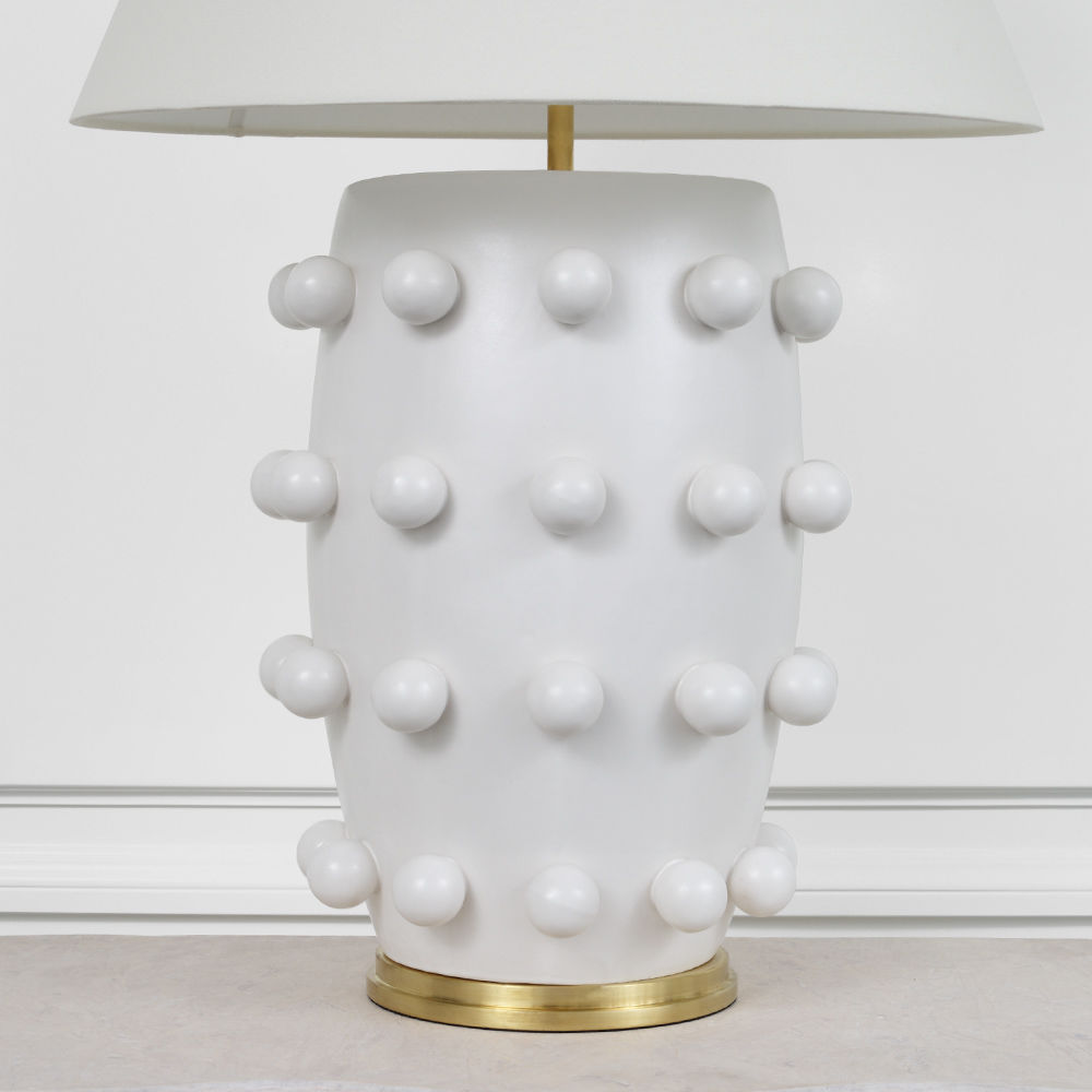 Linden台灯采用精美雕刻的陶瓷底座上的重复装饰球体,充满趣味与精致的对比。 这款台灯采用亚麻色调,古董抛光黄铜细节,并采用黑色或白色石膏饰面。