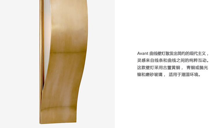 Avant中型线性壁灯凭借线条与曲线之间的纯粹互动,散发出简约的现代主义风格。 这款线性壁灯可以垂直或水平安装,有古铜色,青铜色或抛光镍和磨砂玻璃。 适用于潮湿场所。